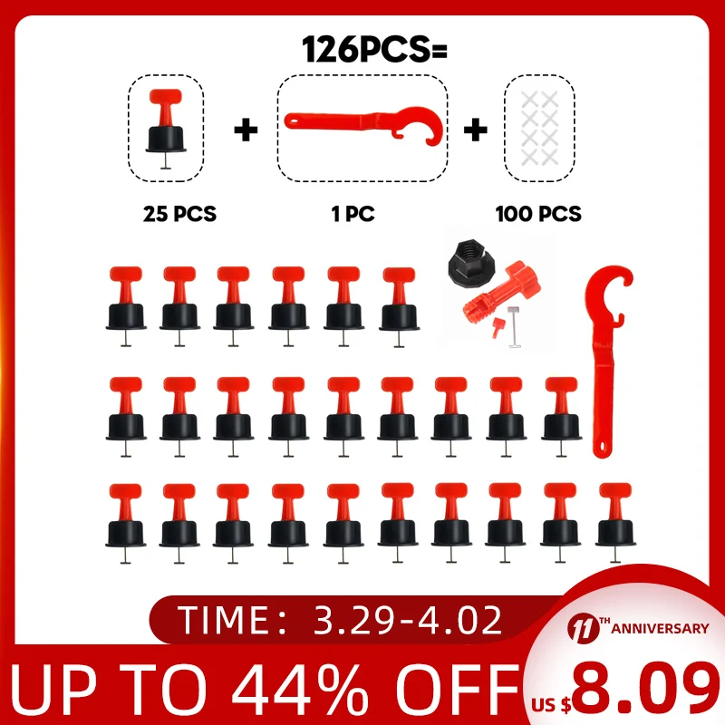 126 шт.: инструмент для выравнивания плитки 25 шт., гаечный ключ 1 шт., распорки для плитки 100 шт.