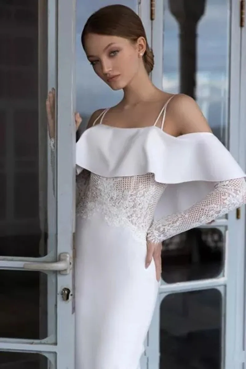 Женское свадебное платье It's yiiya, Белое Атласное Платье 2 в 1 с открытыми плечами, кружевными рукавами и аппликацией на тонких бретельках на лето