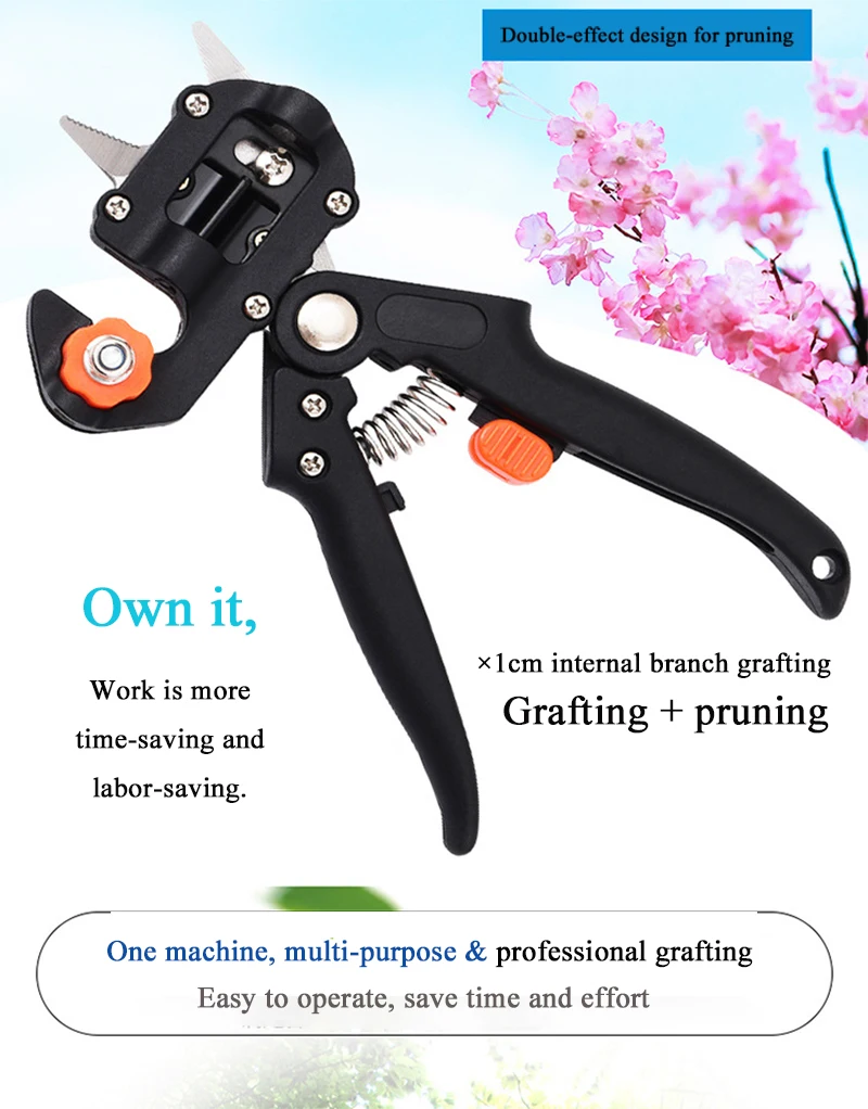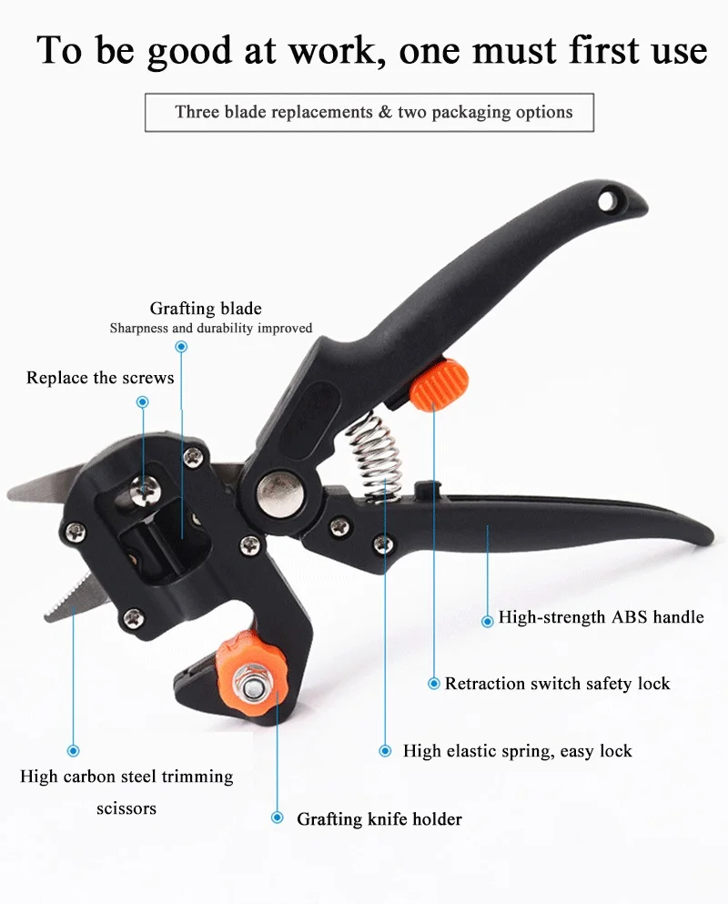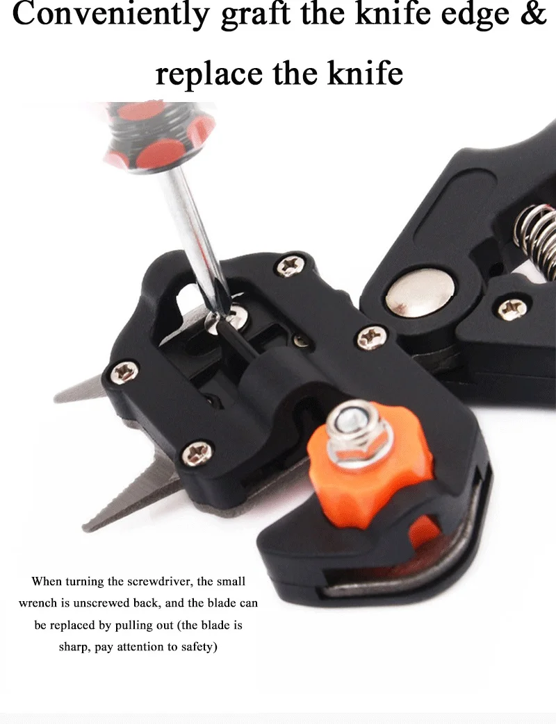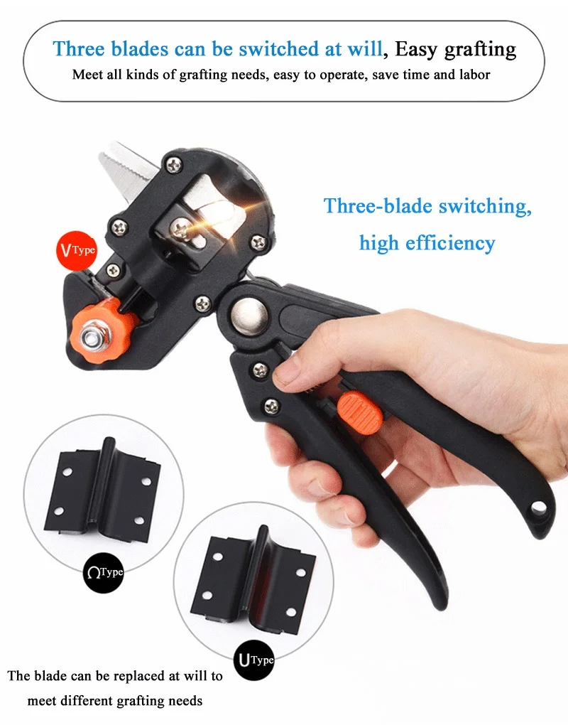 Характеристика:1, Многофункциональность, Прививка и ножницы.2. Высококачественный материал: нержавеющая сталь + АБС-пластик3, сменные ножи, три разных выбора.4, легко и быстро.5, подходит для дерева диаметром 5-12 мм, цветка и так далее.6, размер продукта: 20,5X9,5X3,5 см/8,07X3,74X1,37 дюймов