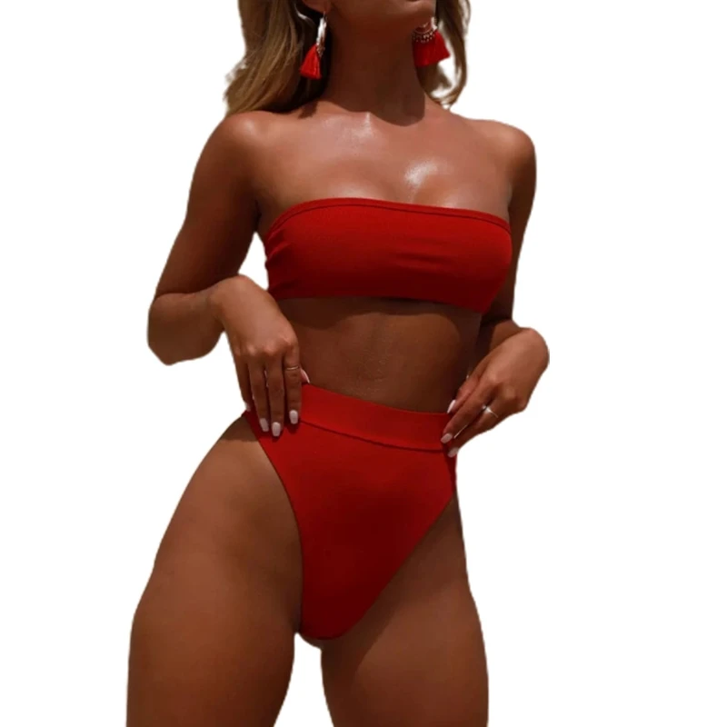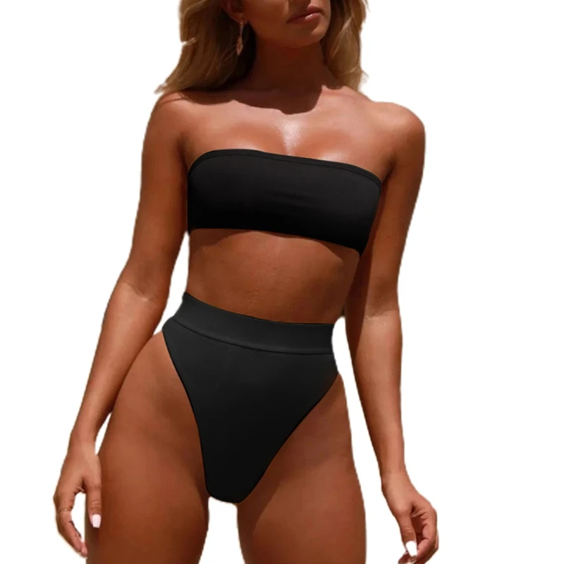 Женский съемный купальник-бикини без бретелек с высокой талией, однотонный купальный костюм из 2 предметов