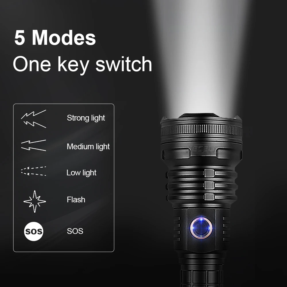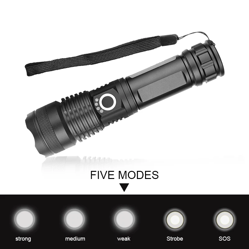 1. Пять режимов: 100%-70%-50%-вспышка-SOS; (любое снаряжение, длительное нажатие, чтобы закрыть)
