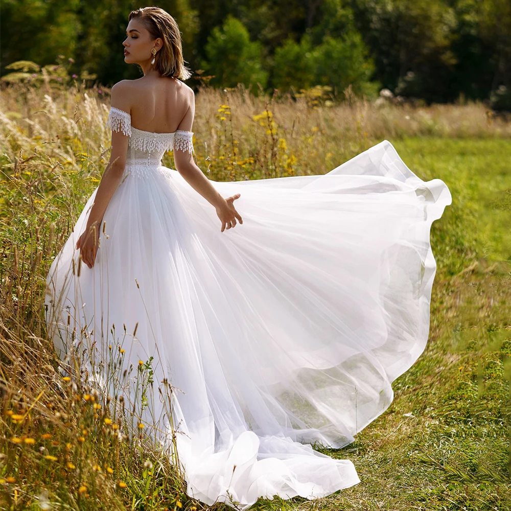 Тюлевые Свадебные платья с открытыми плечами 2022 милое ТРАПЕЦИЕВИДНОЕ кружевное свадебное платье с бахромой с открытой спиной на пуговицах со шлейфом