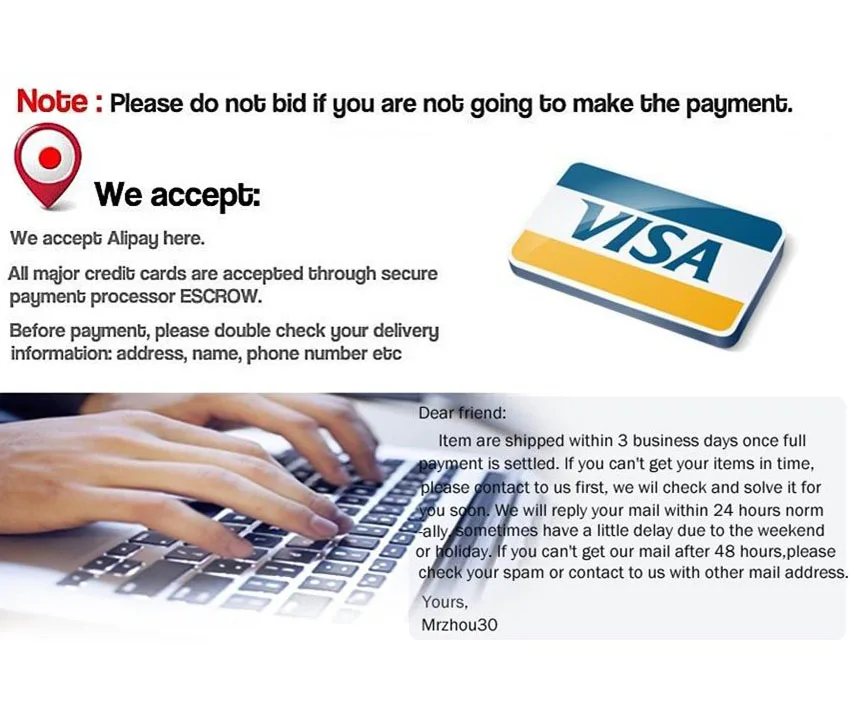 При размещении заказа, пожалуйста, выберите способ доставки и оплаты. Как только оплата будет завершена, мы будем отправлены в течение 3 дней.Снижение стоимости покупки, снижение оплаты таможенных пошлин. Пожалуйста, свяжитесь с нами, чтобы предоставить сумму, которую вы хотите декларировать.Убедитесь, что правильно указаны контактные данные, адрес, почтовый индекс и телефон (полное имя получателя в России).Перед отправкой товара мы строго проверим товар, мы предоставим вам квалифицированную продукцию. Перед упаковкой, наш продукт будет реальными фотографиями, в качестве доказательства ответа на злонамеренные претензии.