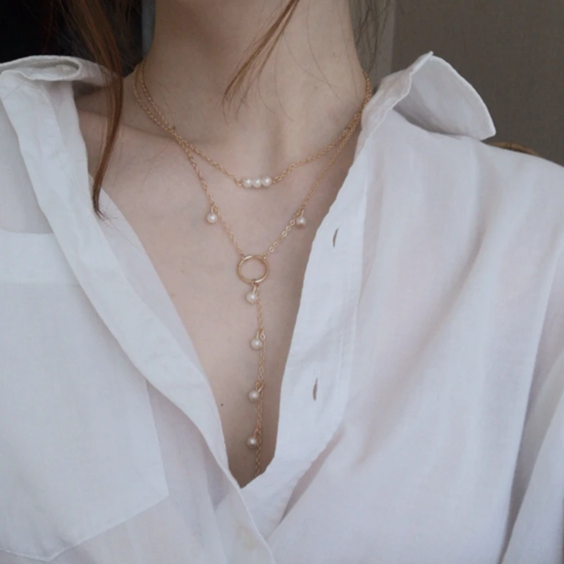 Женское длинное ожерелье с жемчугом, многослойное ожерелье с жемчуж...