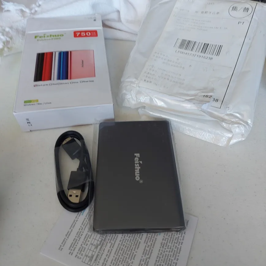 Жесткий внешний жесткий диск, блестящий, который использует его. Работает как на ПК, так и на Mac, в остальном я не знаю. Очень хорошо упакован, доставка через две недели.