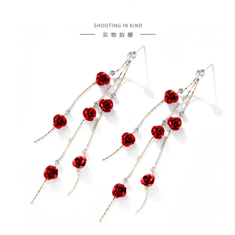 Серьги-подвески с лепестками красной розы женские, бижутерия, длинные висячие серьги-кисточки фиолетового и розового золота, свадебные и вечерние ювелирные изделия