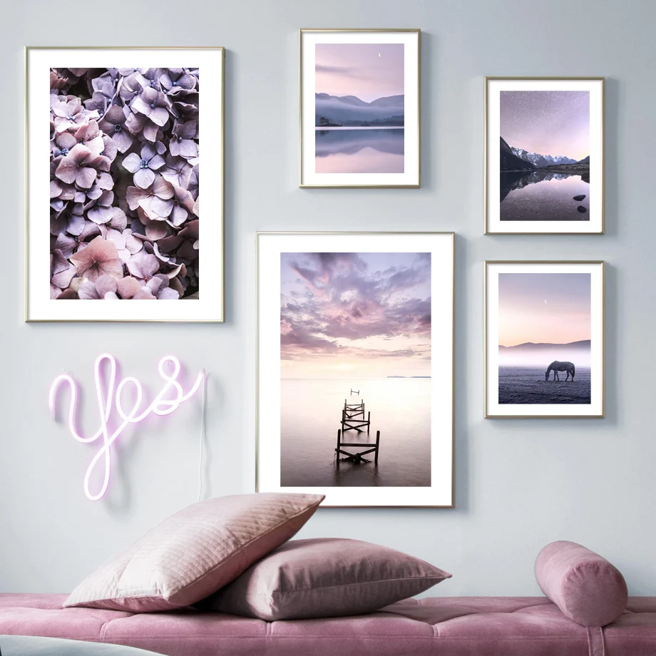 Фиолетовый пейзаж горизонт лошадь спокойное озеро цветок туман скандинавский плакат настенный художественный Принт Холст Картина Декор картинки для гостиной