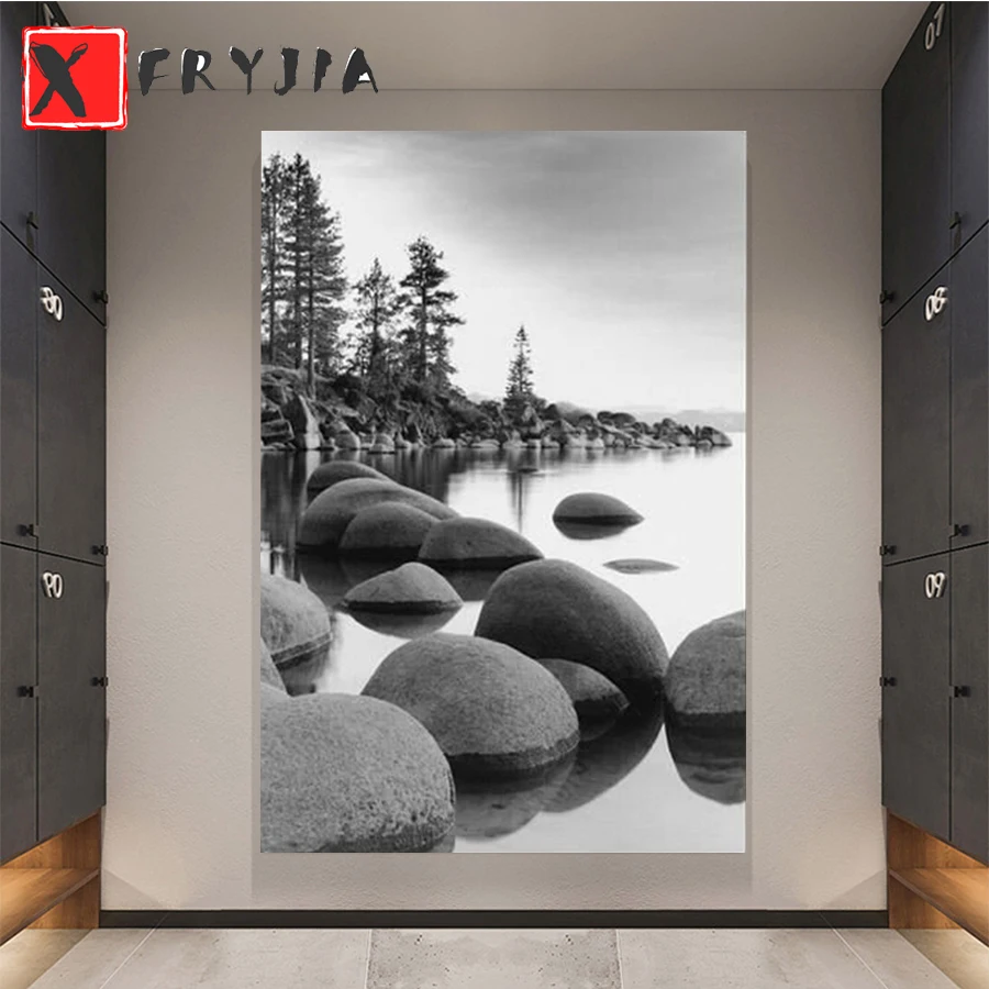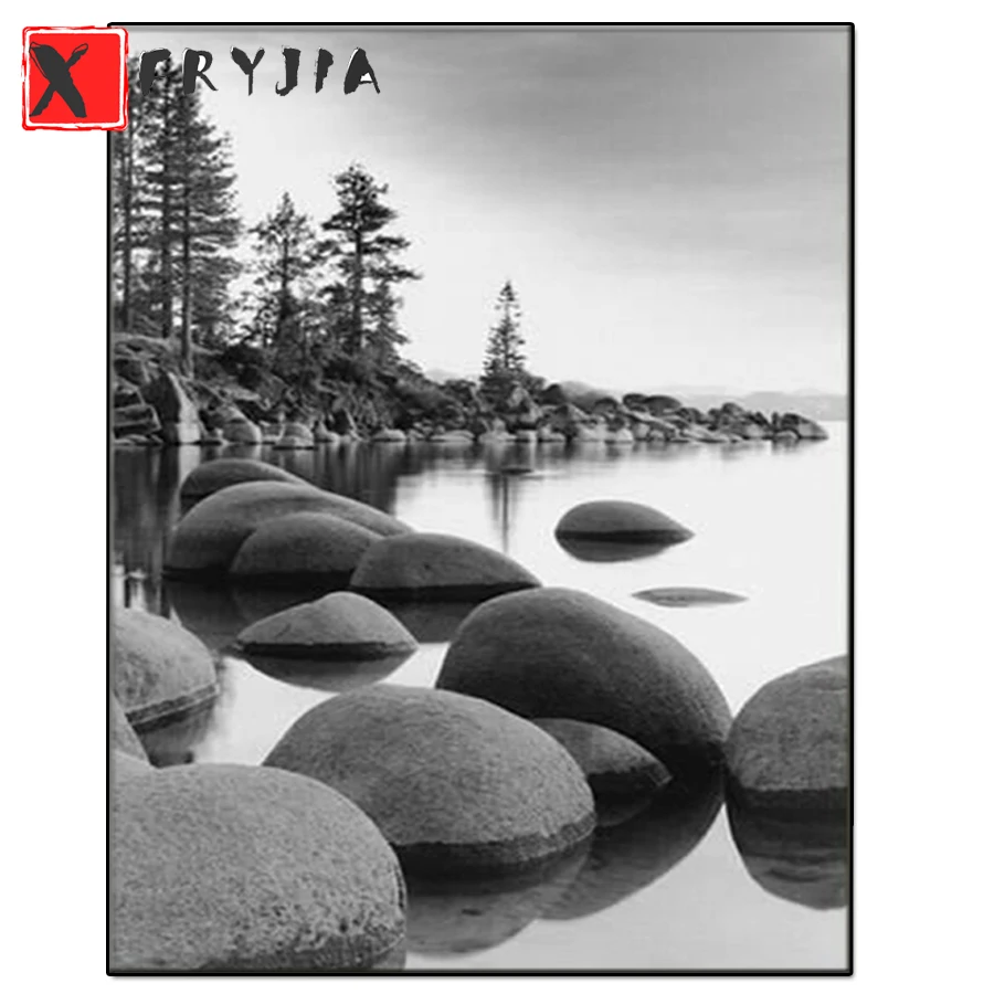 Алмазная живопись для домашнего искусства, черно-белый пейзаж с камнями на реке, 5d алмазная вышивка сделай сам, квадратная круглая Алмазная мозаика