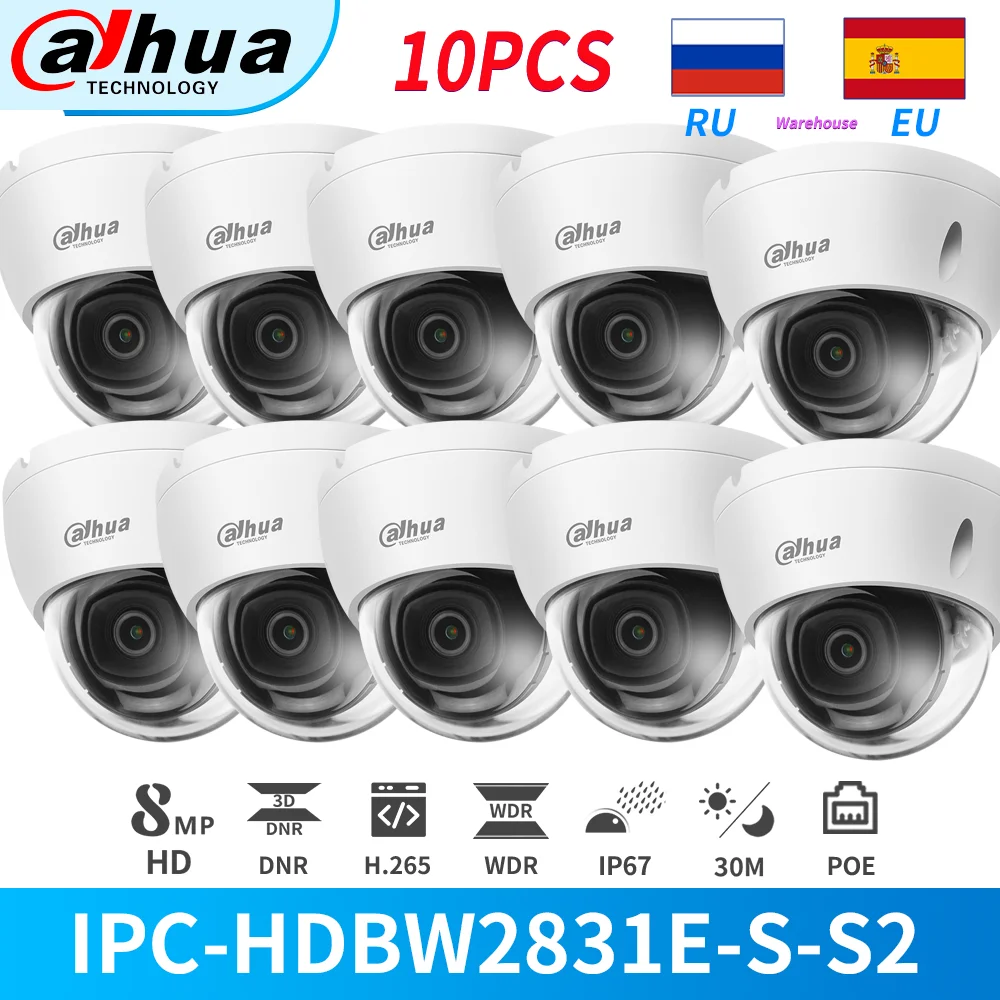 Сетевой видеорегистратор Dahua IP Камера 8MP 4K HD IR купольная камера PoE IPC-HDBW2831E-S-S2 Встроенный слот для карты SD капельницы с датчиком движения IP67 видеонаблюдения камеры 10 шт.