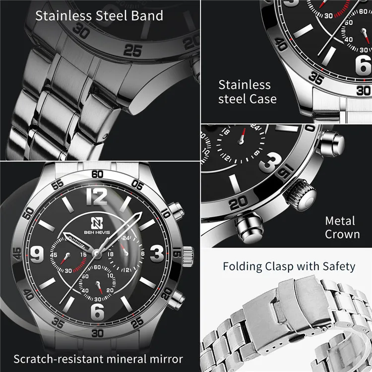 Название бренда: BEN NEVISСтиль: спортивныйТип застежки: складная застежка с безопаснойГлубина водонепроницаемости: 3 барМеханизм: кварцевыйМатериал корпуса: нержавеющая стальДлина ремешка: 26,6 смМатериал циферблата: HardlexЧехол Толщина: 11 ммГруппа Ширина: 19,5 ммЧехол Форма: круглыйТип изделия: кварцевые наручные часыМатериал коробочек и чехлов: бумагаНомер модели: BEN10Материал ремешка: нержавеющая стальОсобенность: ХронографХарактеристики: ВодонепроницаемостьДиаметр циферблата: 45 ммВодонепроницаемость: не подходит для плавания или душаПол: мужчины
