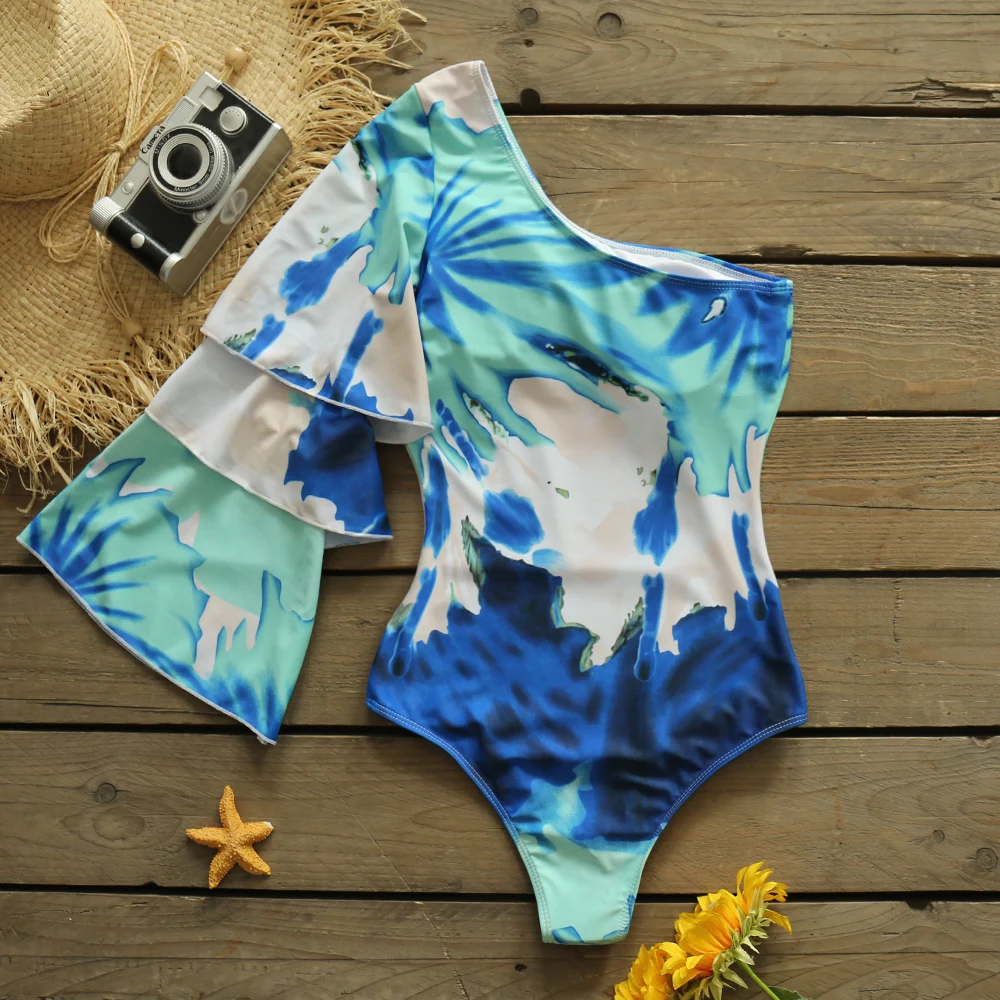 Слитный купальник 2021 на одно плечо многослойный расклешенный рукав купальник женский купальник купальный костюм с принтом Пляжная одежда Монокини