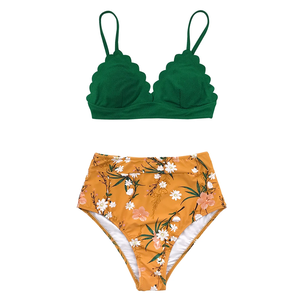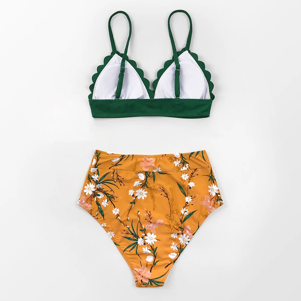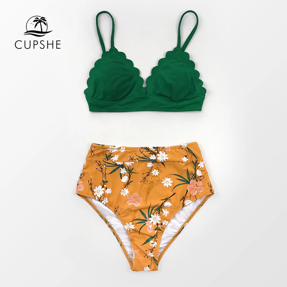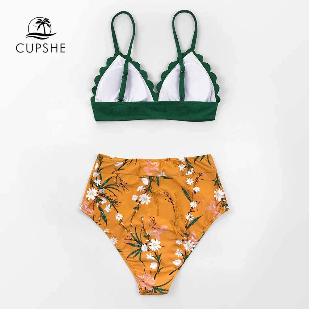 Бикини CUPSHE с фестонами, с высокой талией, зеленый, желтый цветочный купальник, женский купальник из двух частей, пляжный купальный костюм, 2021