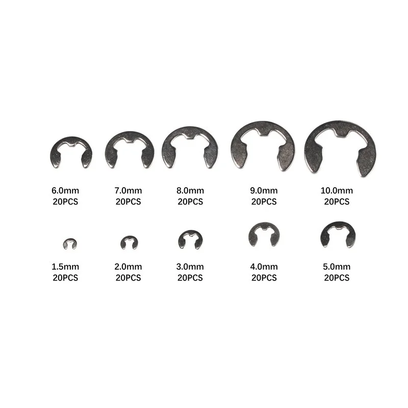 120200550 шт., 1,52345678910 мм, кольца-зажимы, удерживающие комплект пружинных стопорных колец, нержавеющая сталь, углеродистая сталь, клипсы типа E