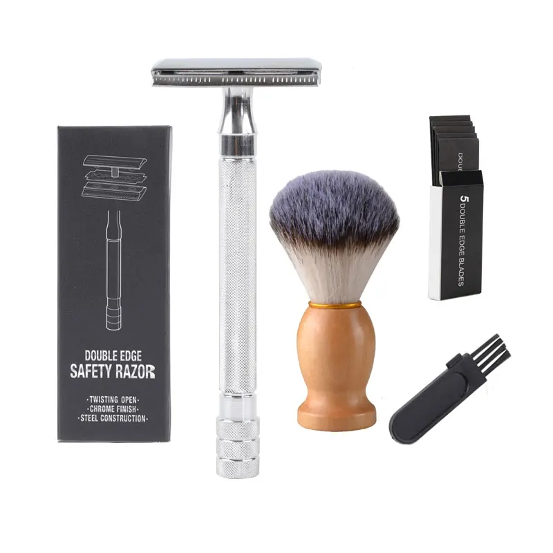 Набор для бритья для мужчин, Классическая Безопасная бритва, щетка для бороды с деревянной ручкой и 1 коробка лезвий, 1 комплект