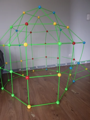 Моя дочь 2 года любит палатку, построенную с этим набором. Я сделал большой набор: 100 стержней и 55 шаров. Модели из инструкции слишком маленькие для моего ребенка. Сейчас у меня есть шатер высотой около 90 см, и для его сборки потребилось около 90% деталей. Размер стержня 31 см, как описано. Остерегайтесь: некоторые более дешевые версии имеют только 20 см стержней. Против: шарики не склеены должным образом. Слишком легко разрезать их на две половинки. Я уже склеил около половины из них растворителем.