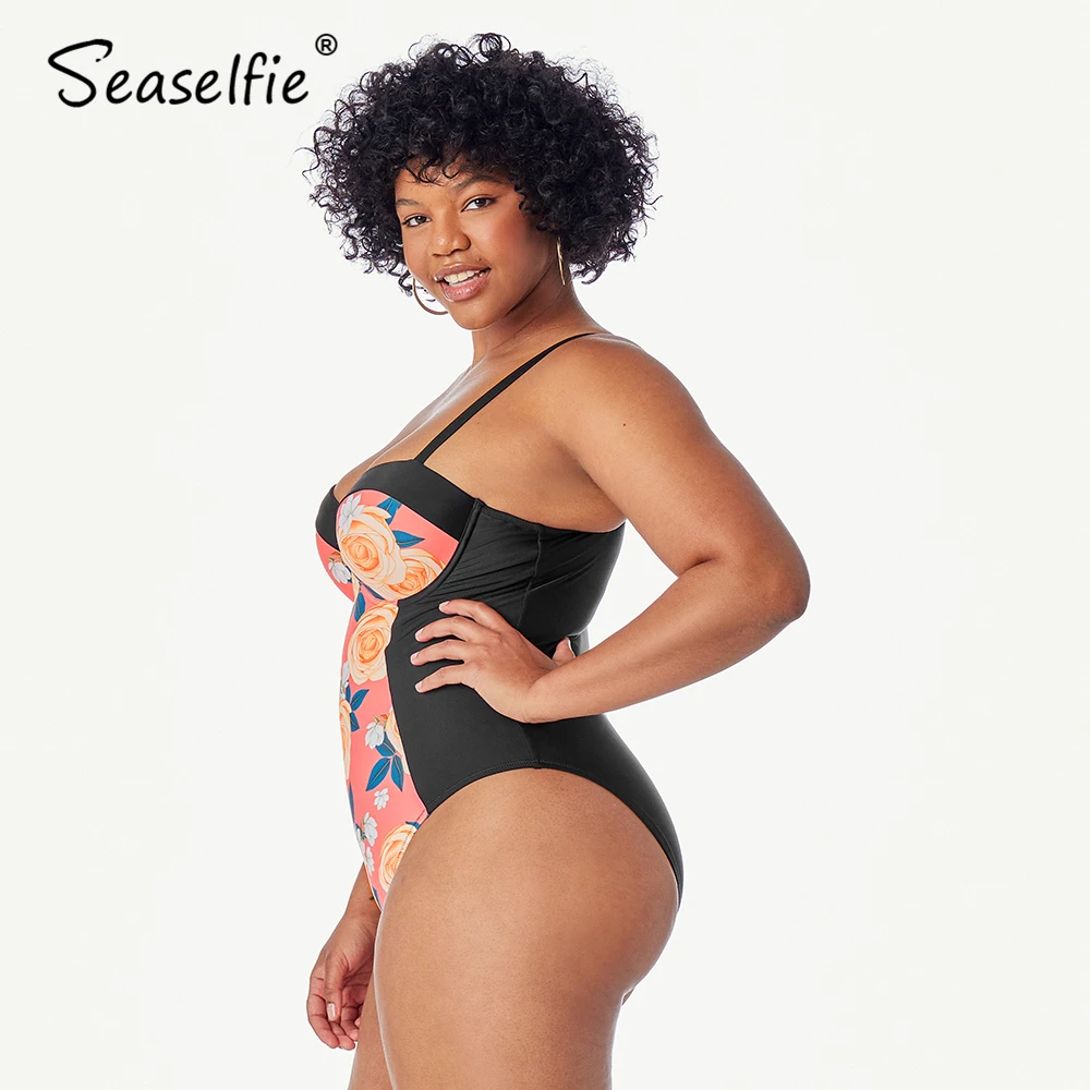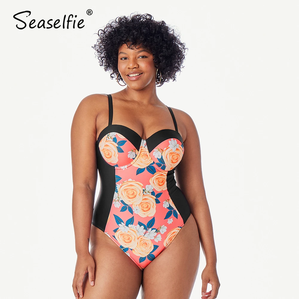 SEASELFIE размера плюс пуш-ап на косточках розовый цветочный цельный купальник женский Монокини большого размера купальный костюм 2022 пляжный купальник