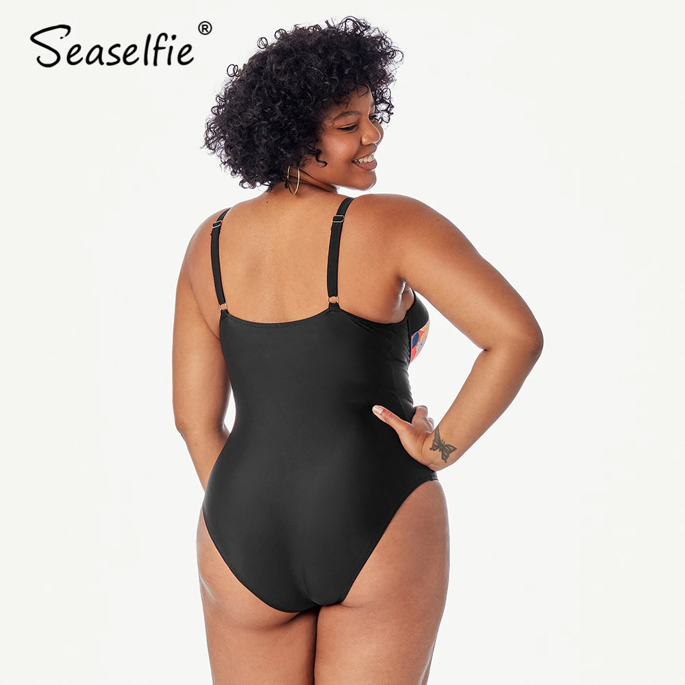 SEASELFIE размера плюс черный сетчатый слитный купальник с высокой ...