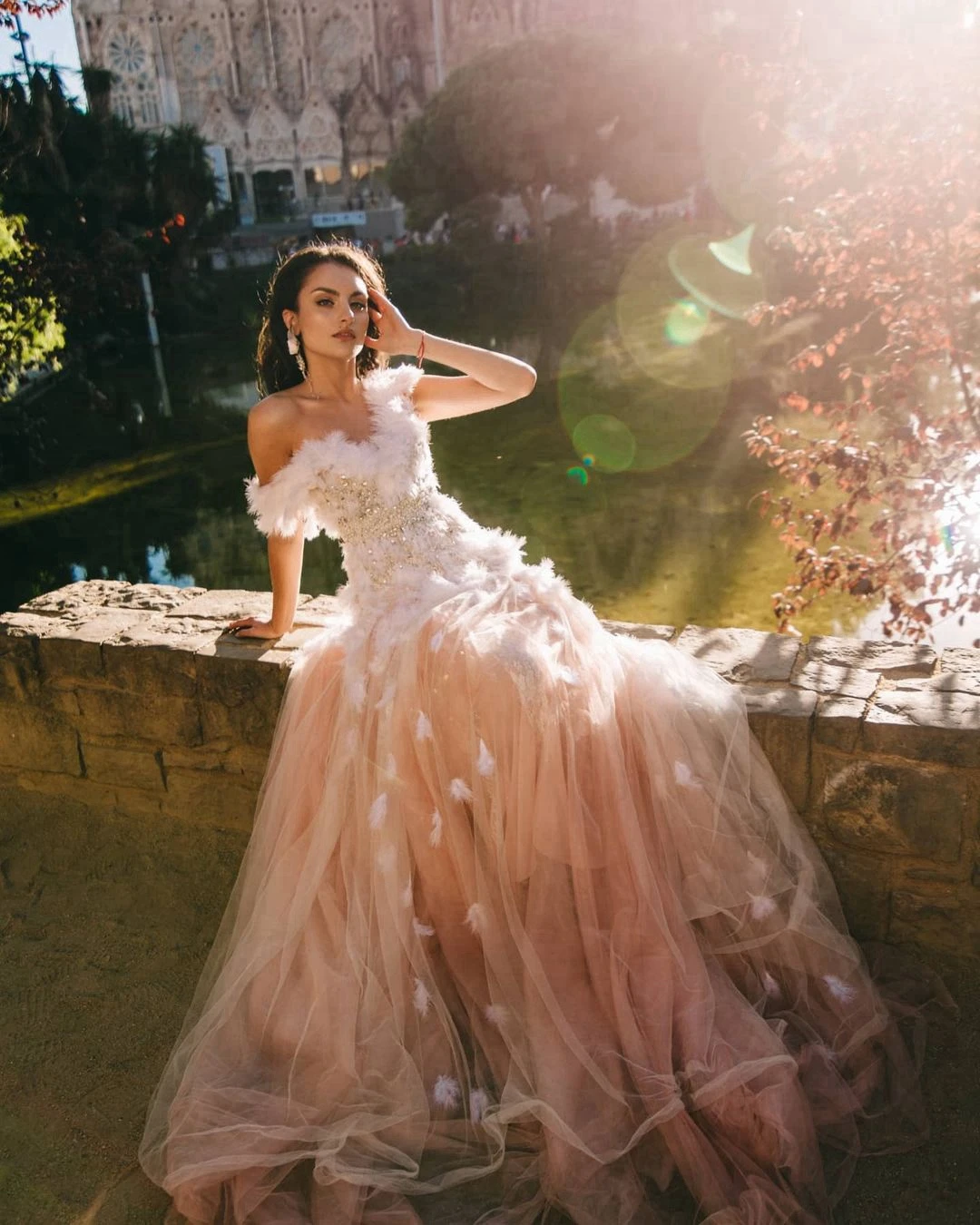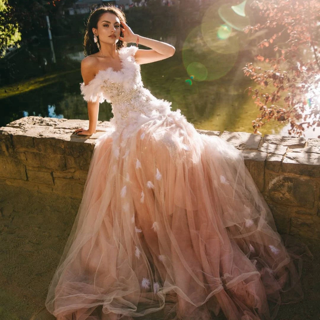 Элегантное платье для выпускного вечера с открытыми плечами сердечком Кристаллы из бисера A-силуэт аппликация перья Многослойные пышные тюлевые вечерние платья