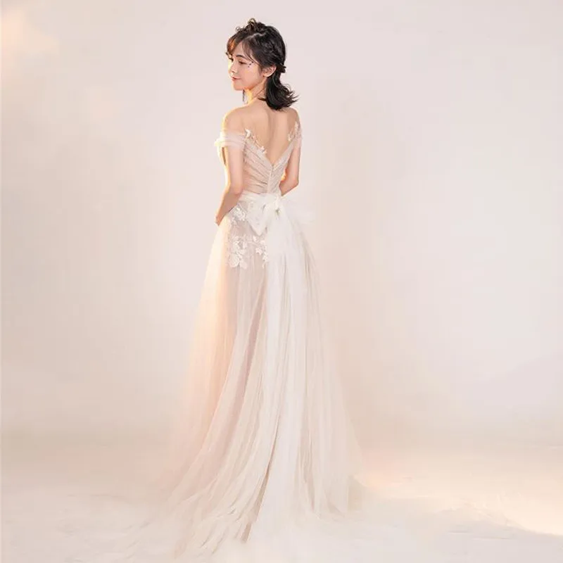 Женское свадебное платье с юбкой-годе, открытыми плечами и шлейфом