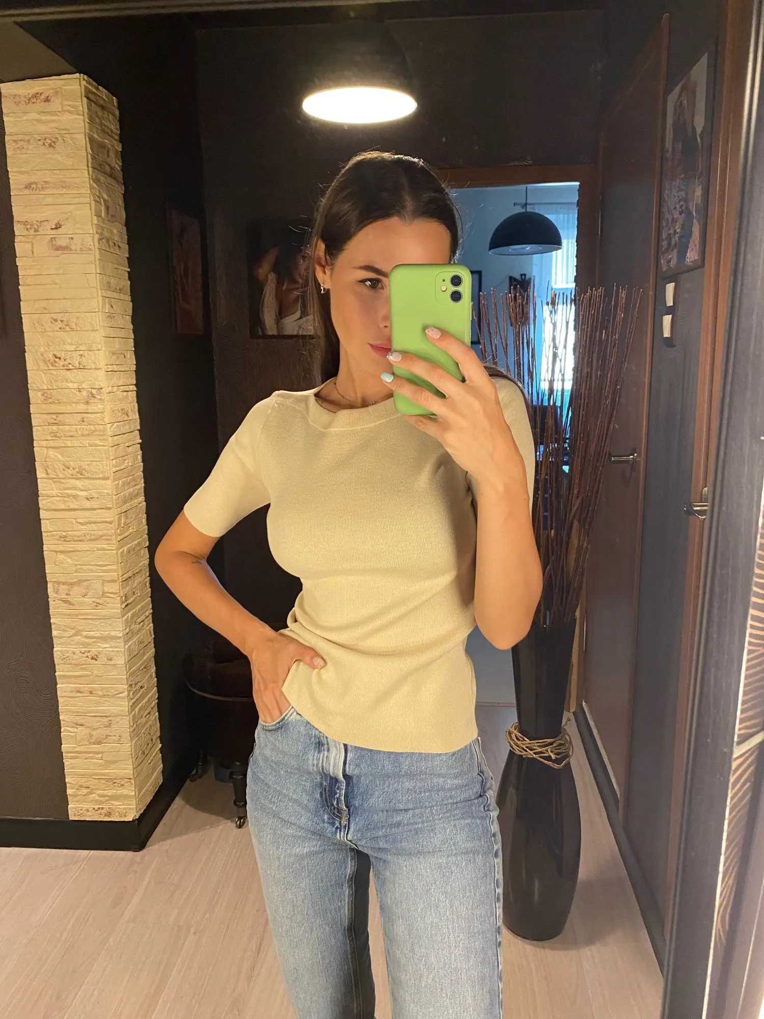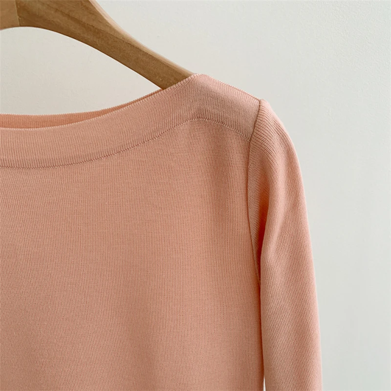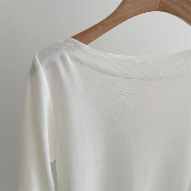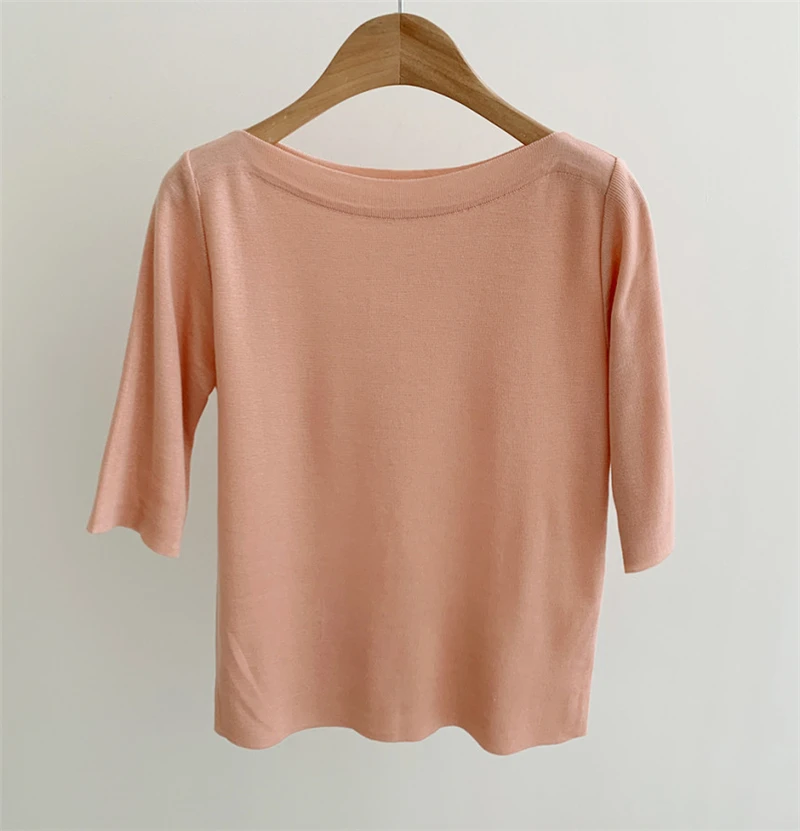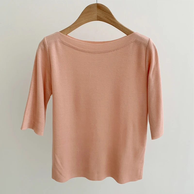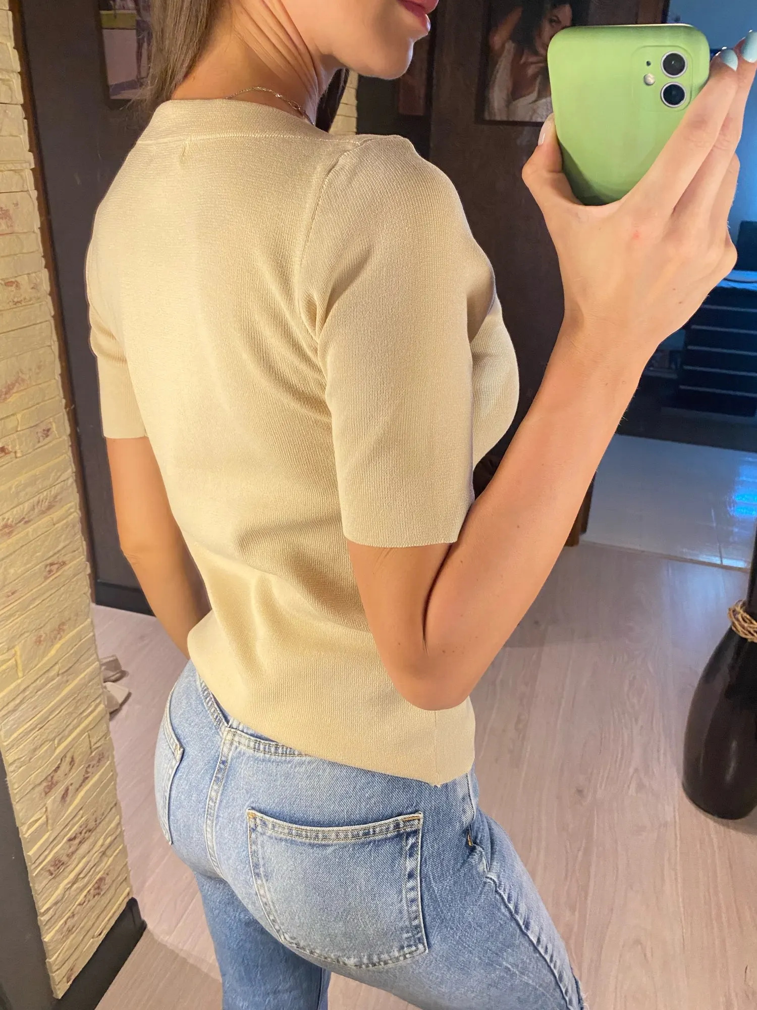 Отличная базовая футболка из трикотажа . Красивая горловина – лодочка. А выполнена машинной вязкой. Очень высокое качество. Хорошо держит форму. Цвет приятный кремовый. Прекрасно тянется. Подойдёт на российский 42 – 46-й размер. У продавца размер единый.