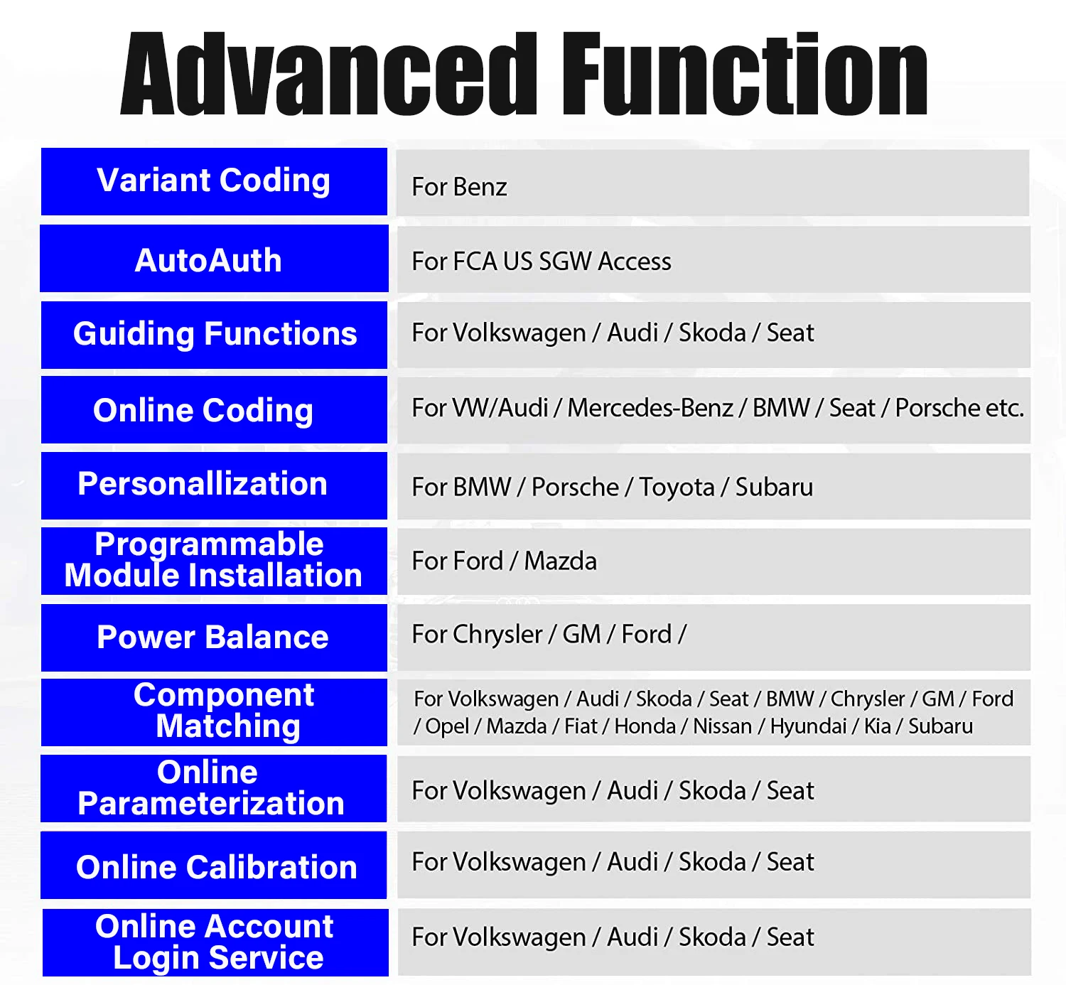 * Функция руководства X431 PRO3S + бесплатна.* Управляемые функции: совместимость с Volkswagen / Audi / Skoda / Seat и т. д.