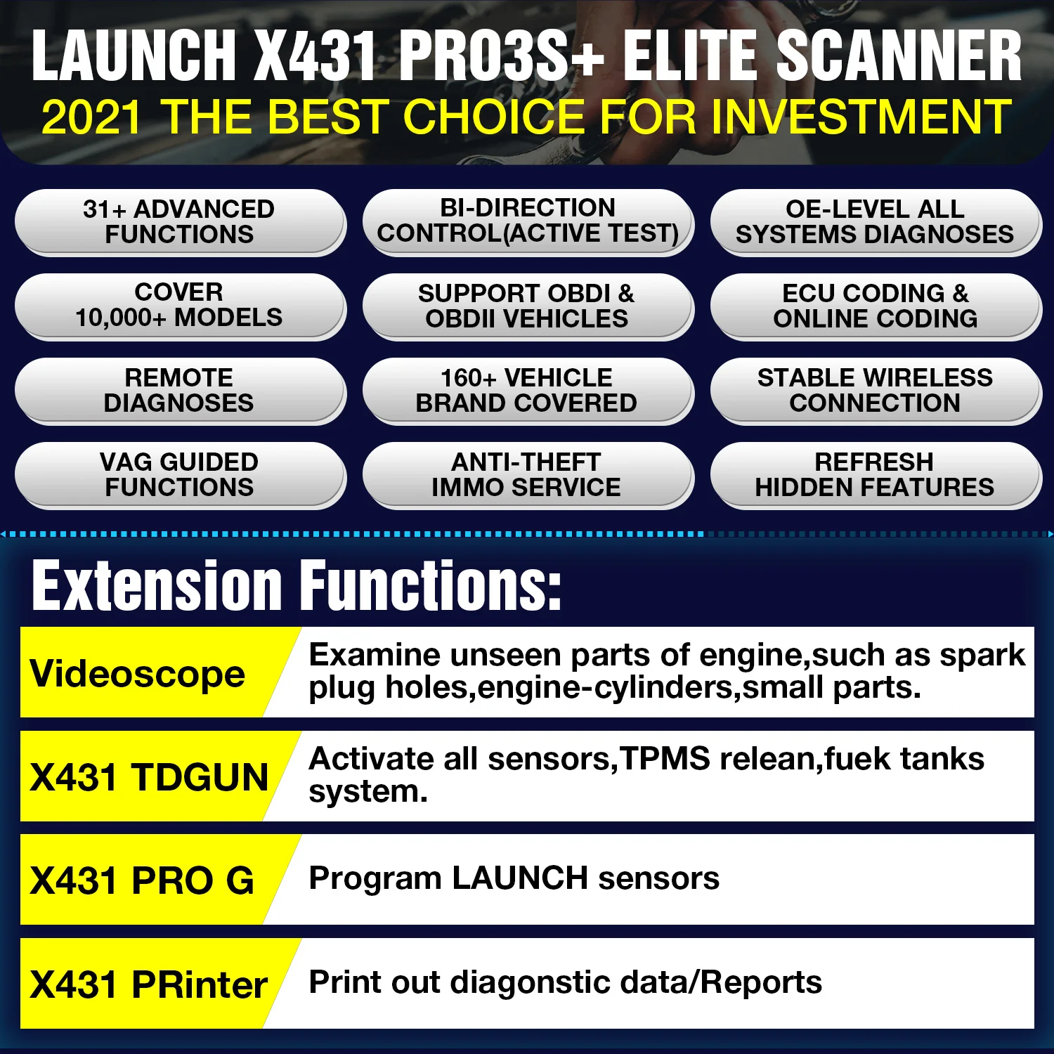 LAUNCH X431 PRO3S +-это профессиональный диагностический сканирующий инструмент, который может диагностировать полные системы во всех системах транспортных средств на ECUs: Чтение/стирание кодов, просмотр данных в реальном времени, получение информации о версии ECU, выполняйте активные испытания и Сервисные функции для всех систем, включая ECM, TCM, ABS, SRS, BCM, IMMO, BMS, TPMS, SAS, топливная система, светильник и система A/C и т. Д. С охватом до 200000 моделей автомобилей по всему миру.