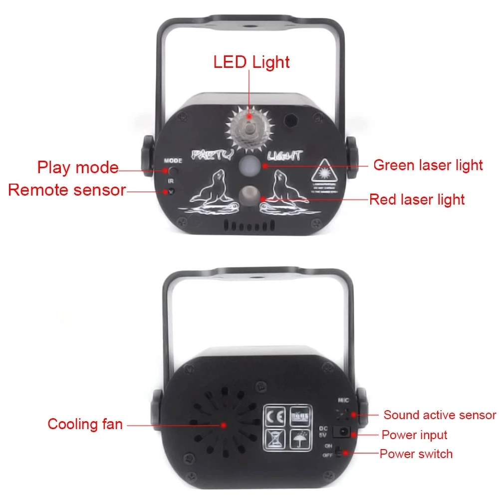 Параметры:Тип товара: сценический светильникМатериал корпуса: алюминиевый корпусУровень защиты: IP20Светильник источник света: светодиодный лазерныйСерия: MiniЦвет изделия: черныйРежим: светодиодный и лазерныйСветящийся цвет: красный и зеленый лазер (светодиодный, красный, синий, зеленый светильник, различные инфракрасные узоры)Напряжение: 100-240 (В)Мощность: 6 ВтПрименимый источник питания: DC 5,0 V /1.0AВходное напряжение: 100-240 В, частота: 50-60 ГцМощность: Красный 100 мВт 650нм, Зеленый 50 мВт 532 нмОсновные сферы применения: бары, дискотеки, Семейные развлечения, танцевальные залы, выступления на сцене, свадьбыРежим воспроизведения: автоматическое воспроизведение, голосовое управление и дистанционное управлениеФункция работы: дистанционное управление, голосовое управление, вращение, стробоскоп, синхронизацияПульт дистанционного управления: регулируемое время освещенияРасстояние проекции: 5-10 метровРазмеры: 75 мм * 13 мм * 60 ммДлина кабеля: 2 метра (78,7 дюйма)Посылка A: USB (без адаптера)1 * мини лазерный сценический светильник (USB plug and play)1 * пульт дистанционного управления (без аккумулятора)1 * USB кабель1 * аксессуары (посылка)1 * Руководство пользователя(USB не включает встроенный аккумулятор)Посылка B: Зарядка от USB (без адаптера)1 * мини лазерный сценический светильник (USB Перезаряжаемый, встроенный аккумулятор)1 * пульт дистанционного управления1 * USB кабель1 * аксессуары (посылка)1 * Руководство пользователяЗарядка от USB со встроенным аккумулятором (Емкость аккумулятора: 4400 мАч, время зарядки: 4-6 часов, время работы: 6-8 часов)Посылка C: Штепсельная вилка европейского стандарта1 * мини лазерный сценический светильник1 * пульт дистанционного управления (без аккумулятора)1 * Соединительный кабель1 * Руководство пользователя(USB не включает встроенный аккумулятор)Посылка D: Вилка стандарта США1 * мини лазерный сценический светильник1 * пульт дистанционного управления (без аккумулятора)1 * Соединительный кабель1 * Руководство пользователя(USB не включает встроенный аккумулятор)Примечание:1. Пожалуйста, будьте осторожны, чтобы не смотреть непосредственно на лазерную диафрагму, чтобы избежать травм глаз.2. Этот блок предназначен только для использования в помещении и должен быть защищен от воды, влаги и тряски.