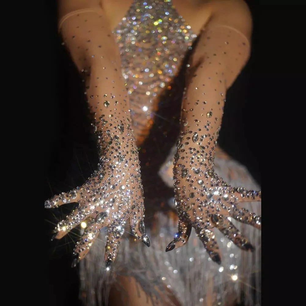 Для женщин к требованиям заказчика; Сверкающие; С украшением в виде кристаллов из сетчатой ткани с длинными перчатки танцор певица для танцев в ночном клубе шоу на сцене аксессуары роскошного эластичного Стразы перчатки