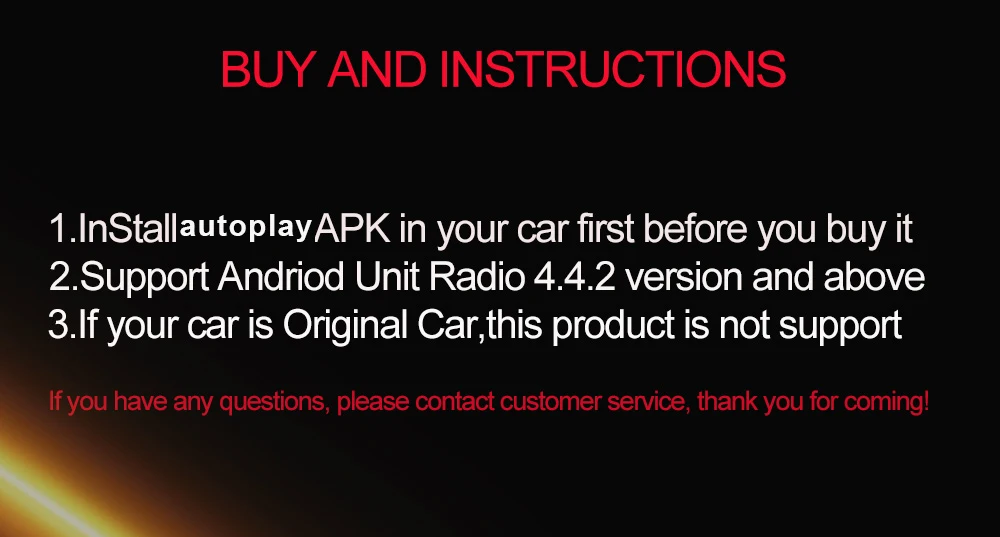 1. Вы можете загрузить приложение Autoplay в автомобильном браузере перед покупкой.Скачать URL: u.paplink.cn/ap(Если вы не можете загрузить его успешно, пожалуйста, не покупайте его)2. Автомобильная система: подходит только для автомобильной системы Android 4,4 выше3. Телефон: Для iPhone iOS 10 и выше илиДля Android phone 4,4 версии и вышеПримечание: Беспроводная carplay может быть выполнена с помощью iPhone, но телефоны Android могут быть подключены только к линии передачи данных для достижения carplay