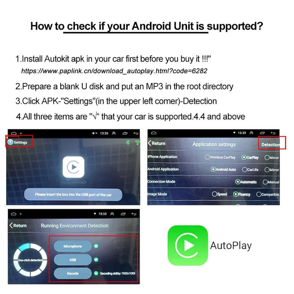 Шаг 1. Установите apk Autoplay в своем автомобиле, прежде чем купить его!Apk:u.paplink.cn/apШаг 2. Подготовьте пустой u-диск и поместите MP3 в корневой каталогШаг 3. Нажмите APK-«Настройки» (в левом верхнем углу)-ОбнаружениеШаг 4. Все три элемента «√», что ваш автомобиль поддерживается.(Примечание: на изображении показан шаг 3. Шаг 4 и приложение для загрузки)