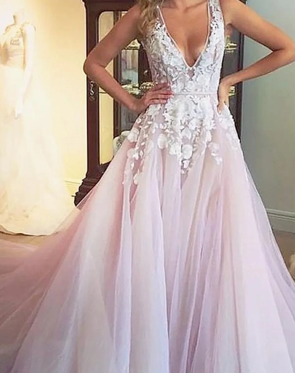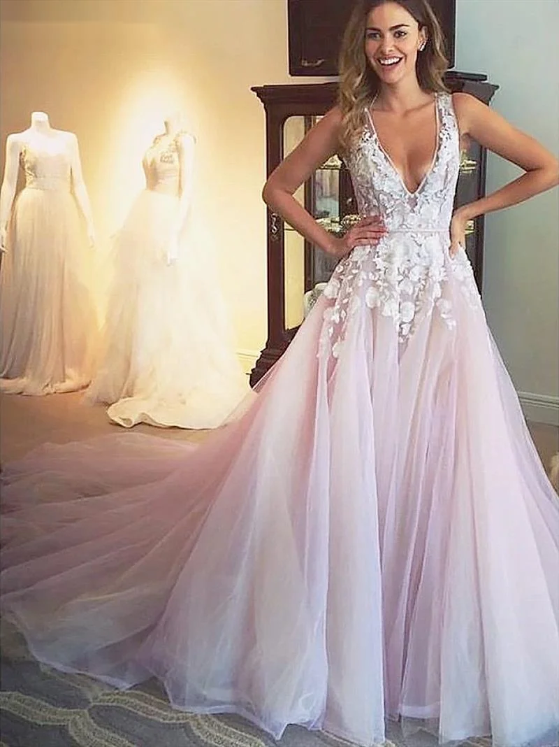 Вечернее платье-трапеция со шлейфом, светильник-розовое Тюлевое платье с глубоким V-образным вырезом, с аппликацией, с вырезом на спине, платье для выпускного бала без рукавов