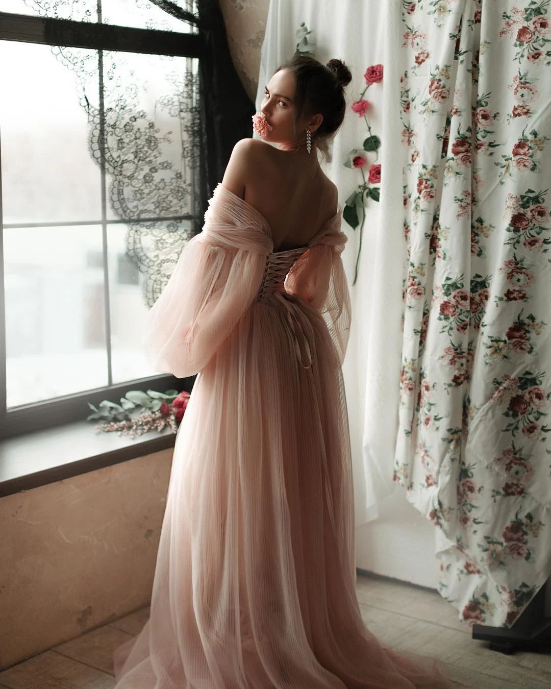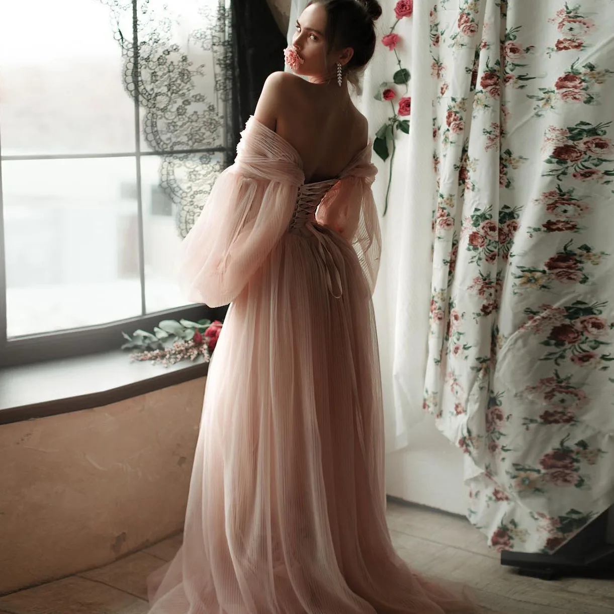 Изысканное платье для выпускного вечера А-силуэт с открытыми плечами рукавами-пузырями аппликация милое многослойное Тюлевое вечернее платье на шнуровке на заказ