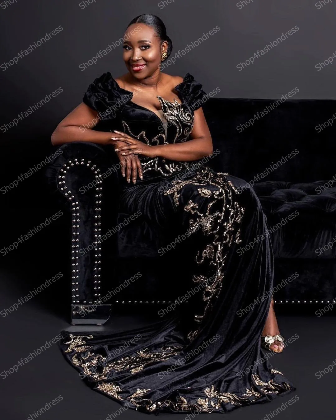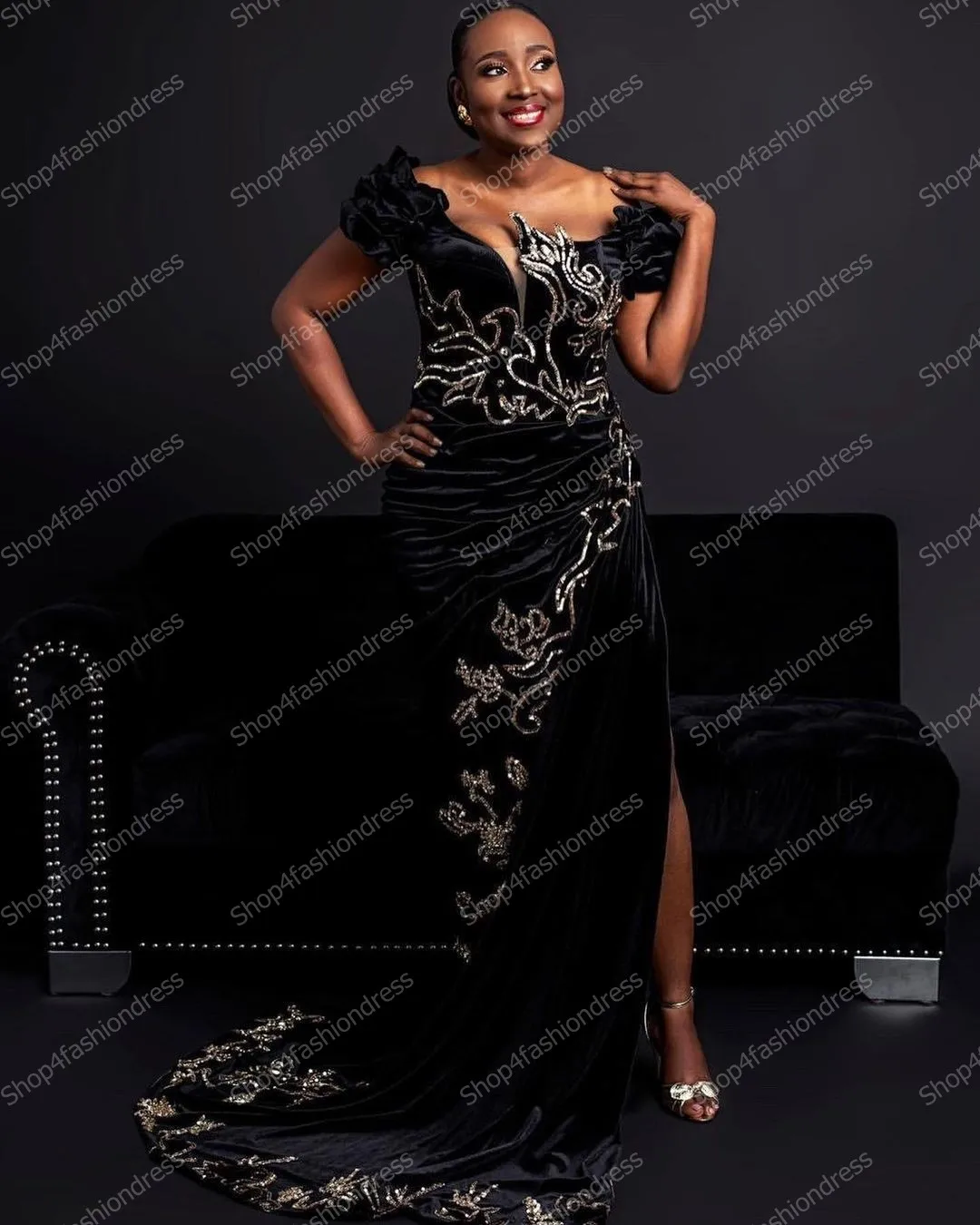 Черное вечернее платье Aso Ebi с блестками, кружевное вечернее платье с разрезом сбоку в африканском стиле, Сексуальные вечерние платья с оборками и рукавами