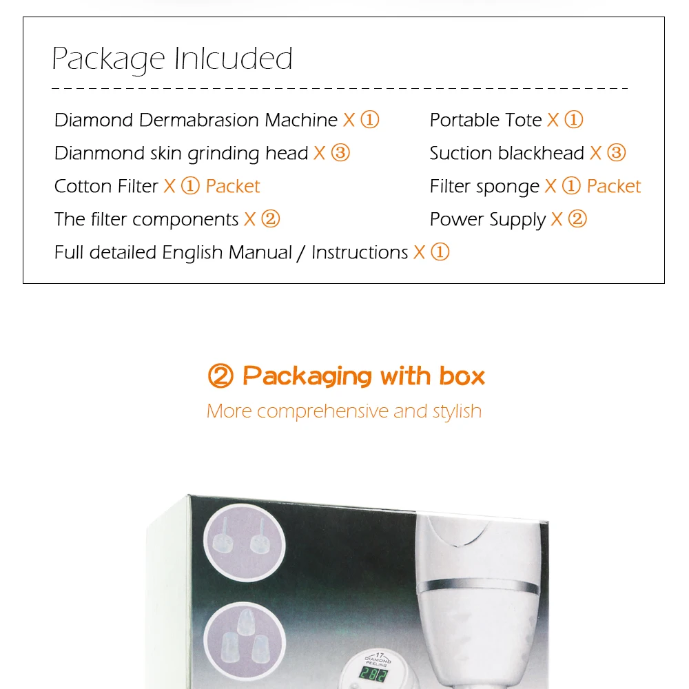 Маленький, легкий, легко носить с собойУдобный для домашнего использования и портативный3 различных степени толщины алмазных наконечниковМаленькие алмазные наконечники используются в нежных и чувствительных частях кожи(Вокруг глаз), средние алмазные наконечники используются для лица и шеи с большим бриллиантомСоветы используются для огрубевшей кожи и морщин (например, тела, локтя и колена)3 различных размера вакуумной обработки головкиДвойное устройство фильтрации, легко моется, предотвращает засорениеВ интерьер машины эффективно