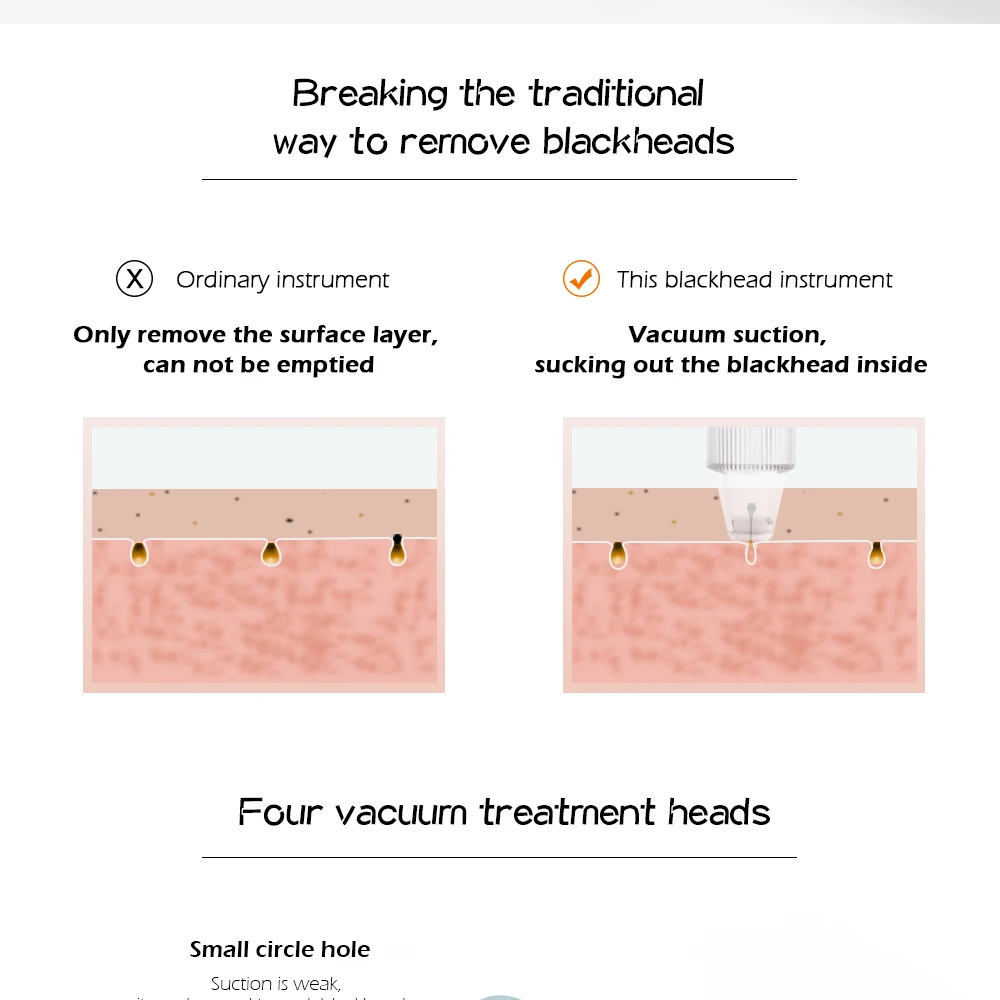 Маленькое круглое отверстие: всасывание слабо, его можно использовать для всасывания черных точек, подходит для более тонкой кожи.