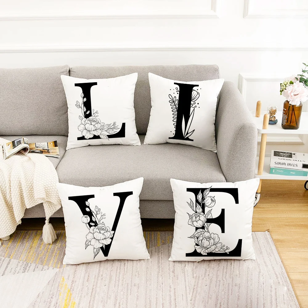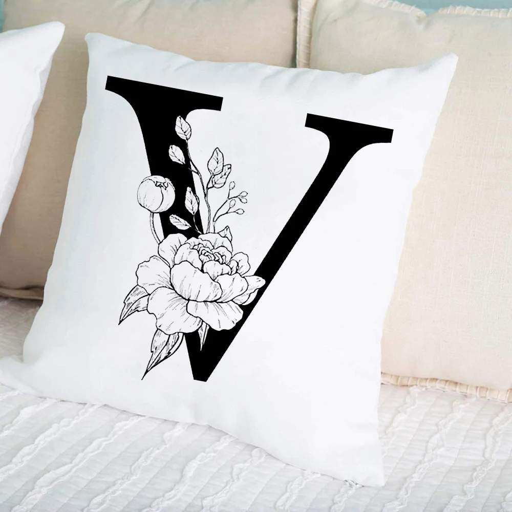 Чехол для подушки с черным алфавитом и цветочным принтом, белый чех...