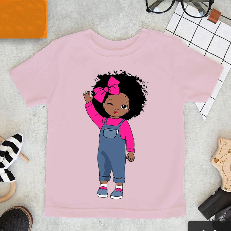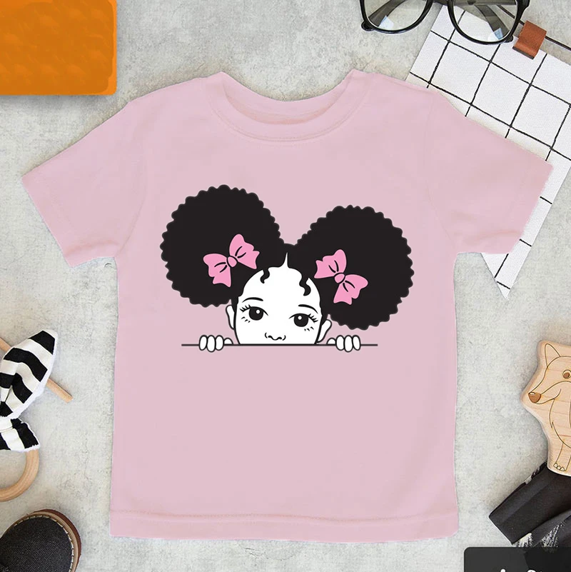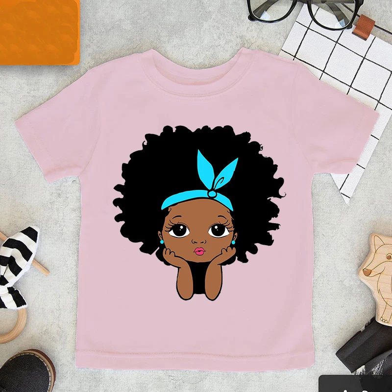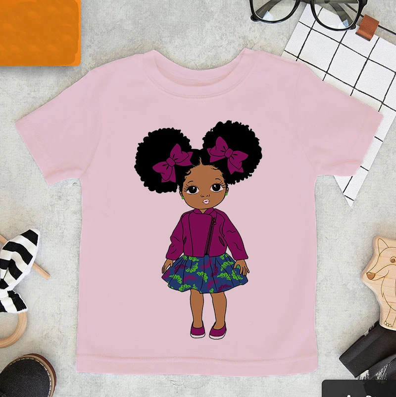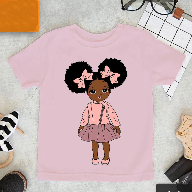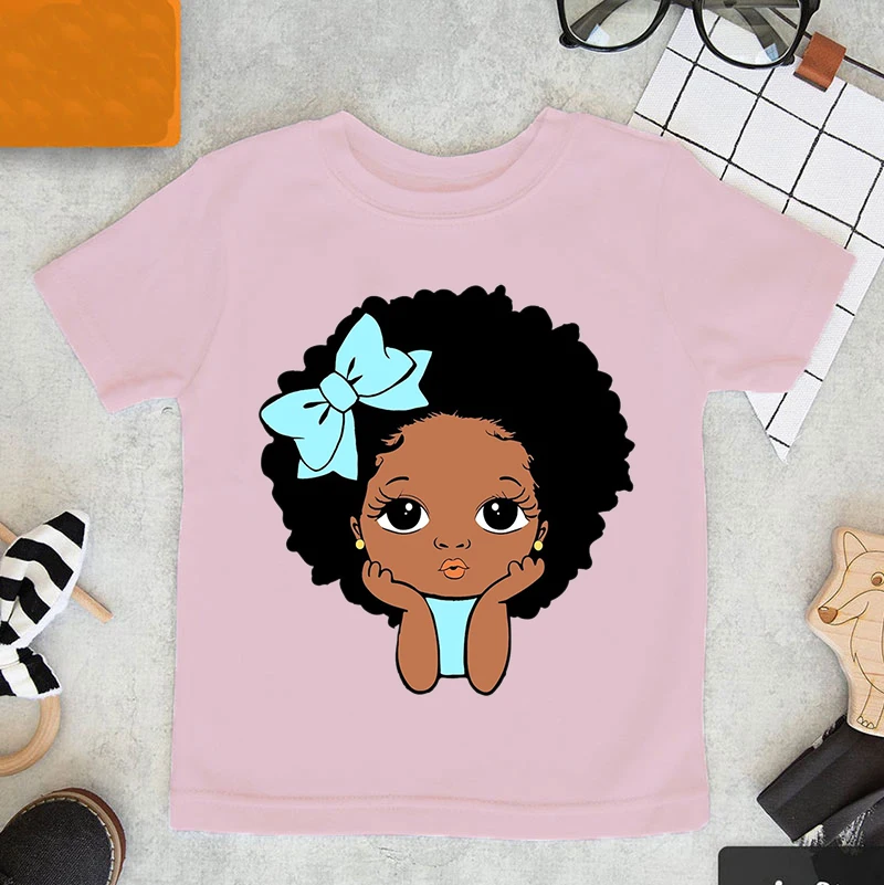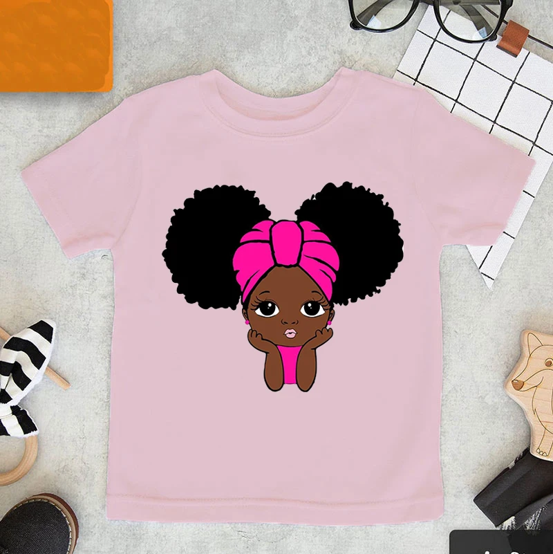 Детская футболка, Милая Черная футболка с принтом принцессы меланина и пушистыми волосами для девочек, летняя розовая футболка для девочек, топы высокого качества с коротким рукавом