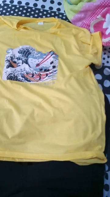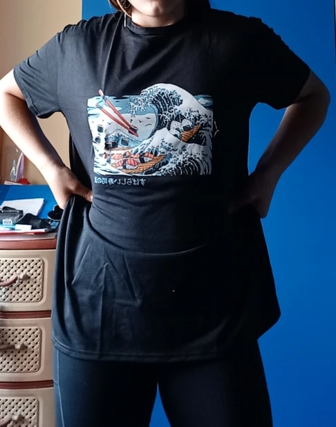 З чого розпочати. Ну по-перше, фудболка не відповідає фудболці на фото. Можна з першого погляду побачити, що вона має, начебто, довгі рукава, і схожа оверсайз. Але це нетак. Рукава короткі. Вона ЗОВСІМ не оверсайз. Є трошки завуження на талії, тобто вона не відчувається вільною. Я не задоволена. Єдине, що подобається - малюнок. От виріжу його із фудболки, повішу на стіну і буду плакати , за що я тільки вітдала гроші. ?