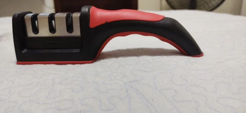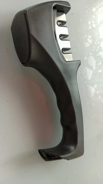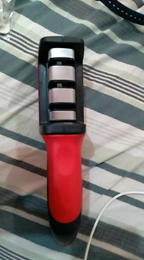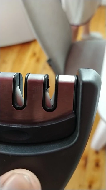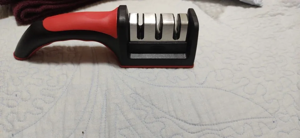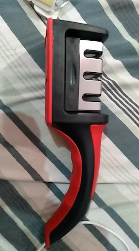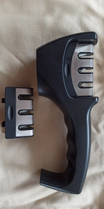Это вторая точилка с Али. И, увы, с первой не сравнить,- дешёвая копия. Первую заказала, тяжеленькая, пластик добротный и приятный, не скользит в руках. Точильные ножи три разные: грубый, средний и керамический. В этом же магазине: пластик тонкий, хлипкий, ножи: 1 - как средний (в предыдущей точилке), и два- одинаковых белых. Куски пластика на швах и стыках не обработаны и не обрезаны, торчат. Жестянка вся гуляет. Короче, Небо и Земля. Увы! Не рекомендую здесь покупать, лучше поискать более качественные в других магазинах.