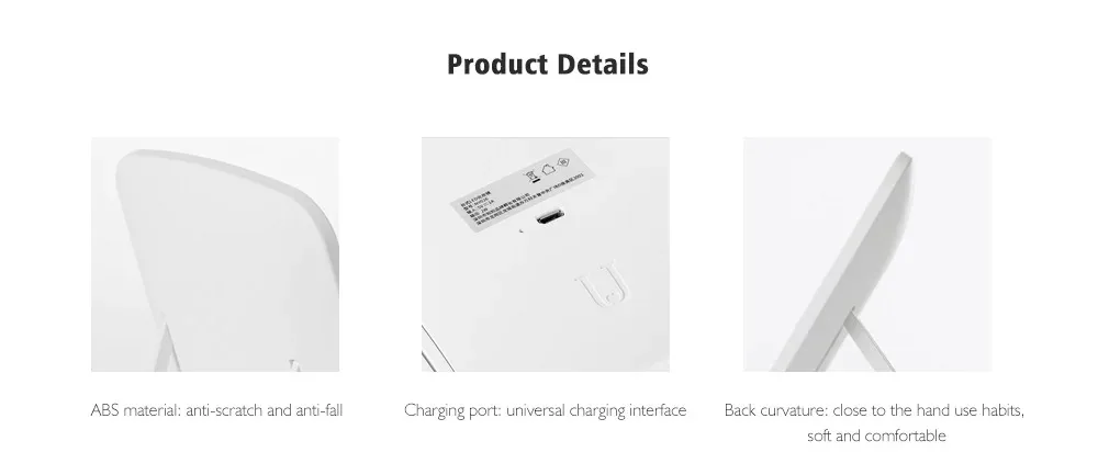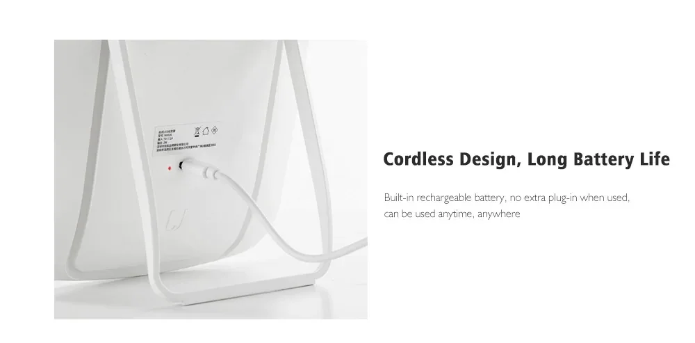 Основные характеристики:● Светодиодный светильник с естественным наполнением, светодиодный светильник высокой плотности, мягкий и яркий, как лунный светильник● Высокий цветовой светодиодный светильник, 33 светильник бусины равномерно объемного, имитация природы светильник, косметика из-за отсутствия светильник в помещении● Зеркало для макияжа более четкое, мягкое и менее яркое, а стробоскопическое не более удобное● Встроенный аккумулятор емкостью 1200 мАч, может заряжать аккумулятор, не нужно часто менять● Энергосбережение и охрана окружающей среды, без дополнительной проводки, без привязки● Гибкая регулировка угла, также приятно смотреть в зеркало● Материал: АБС-пластик и стекло● Номинальное напряжение: 5 В/1 А● Время зарядки: 2 ч● Время использования: 48hВес изделия: 0,37 кгРазмер продукта: 23,80*16,80*2,50 см/9,37*6,61*0,98 вПосылка: 1 светодиодный косметическое зеркало, 1 usb-кабель, 1 руководство пользователя