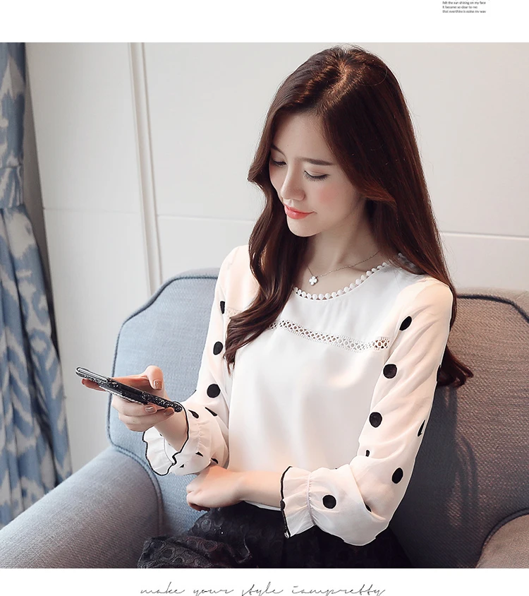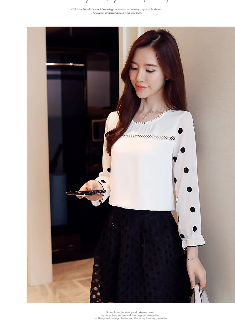 Шифоновая Женская одежда, милые белые топы в черный горошек с круглым вырезом, блузы с длинным рукавом, женская блузка, рубашка, 2021
