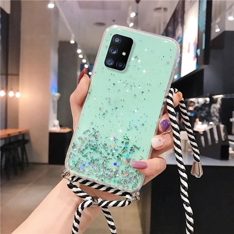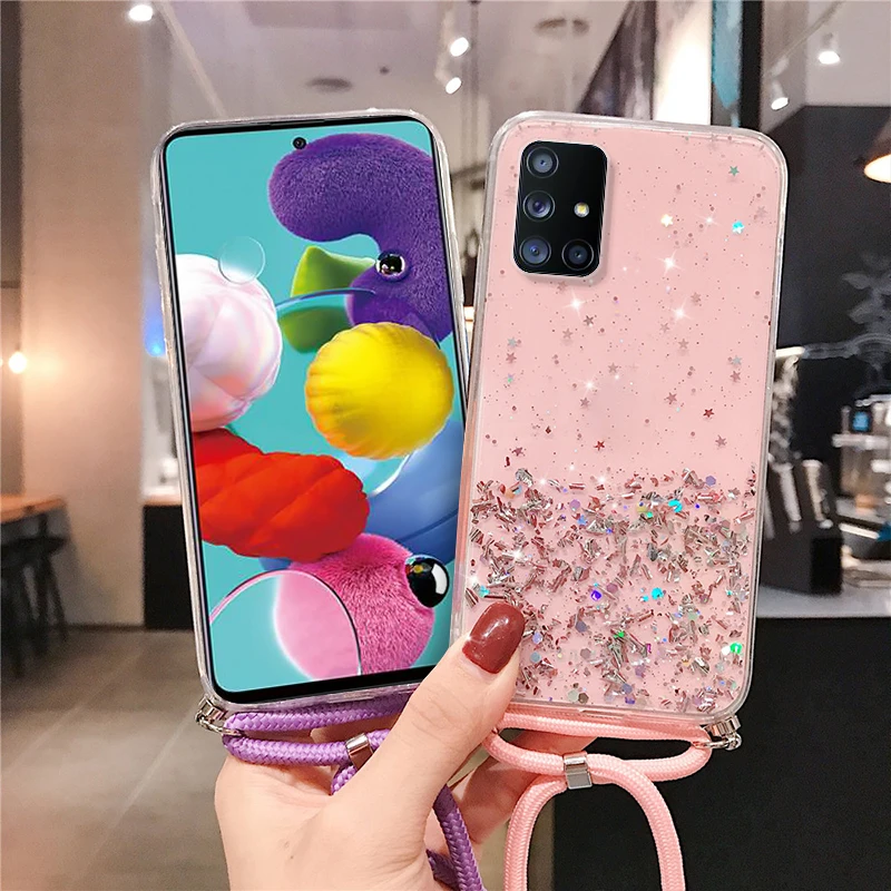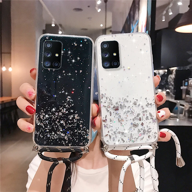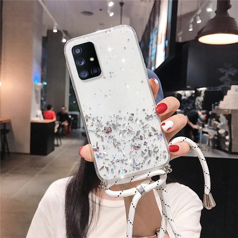 Прозрачный блестящий чехол с ремешком на шею для Samsung Galaxy M52 5G S20 FE S20 Plus S21 Ultra A51 A71 A32 Note 20 Ultra A52, чехол