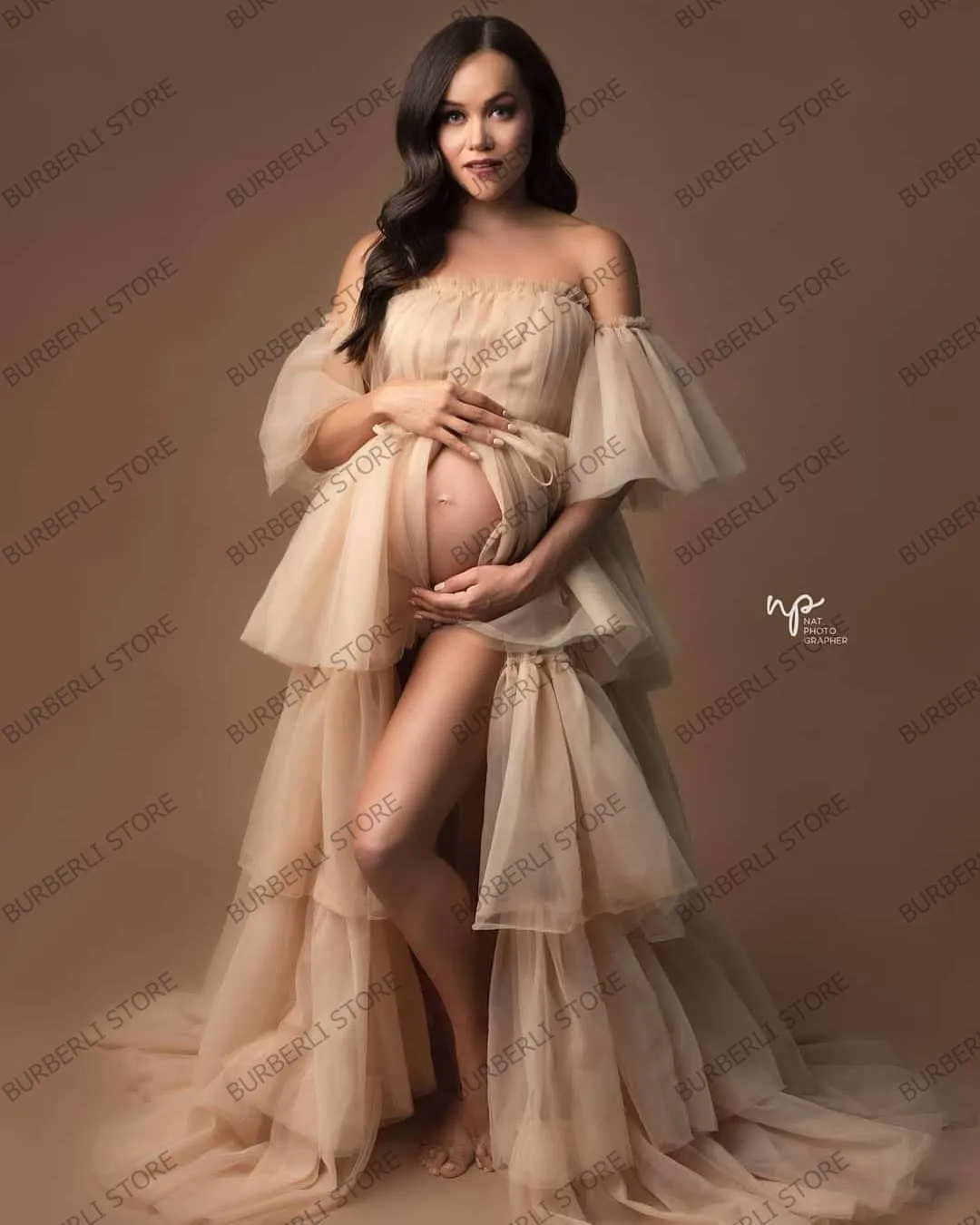 Элегантное платье для беременных с открытыми плечами и многоярусными оборками из фатина для фотосъемки мягкие тюлевые Платья А-силуэта для будущей мамы