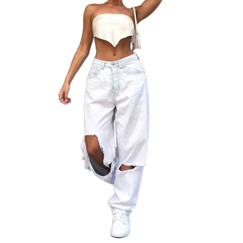 Женские рваные джинсы Уличная мода Женские джинсы Большие рваные повседневные белые Женские брюки уличная одежда