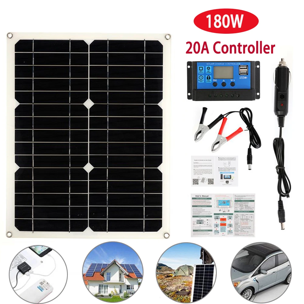 Портативная солнечная панель 180 Вт 12 В с контроллером 20 А, 2 USB...