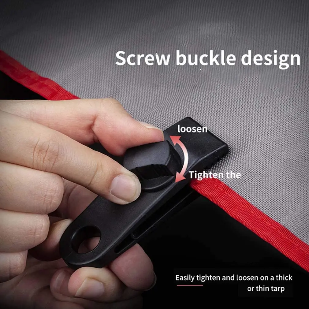 Прочный материал:Изготовлено изПрочный нейлоновый материал, водонепроницаемый и устойчивый к поломке,Вы можете использовать эти брезентовые зажимы в течение длительного времени.