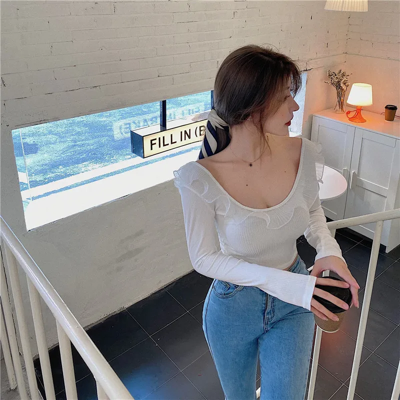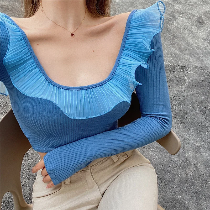 Женская Сетчатая футболка с оборками, привлекательный облегающий топ синего цвета с квадратным вырезом и длинным рукавом, весна-лето 2021, новинка, 49U5