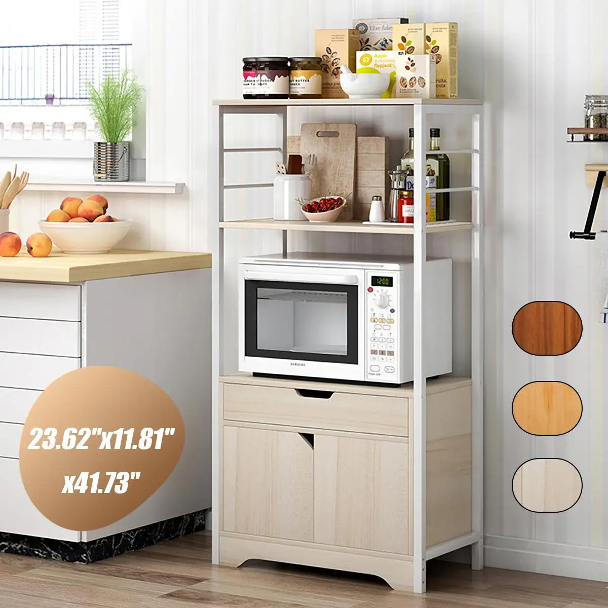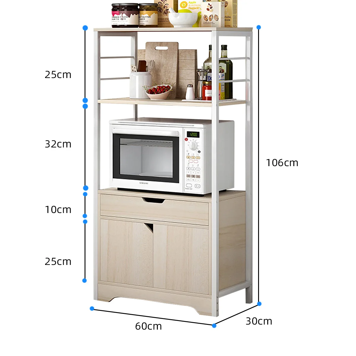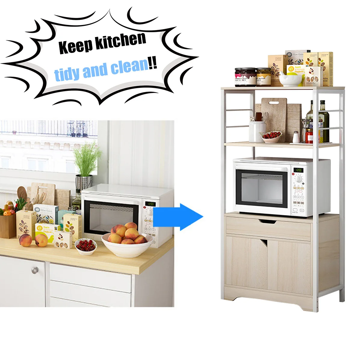 Особенности:◆Spacious. 3 яруса полки + 1 ящик + 1 шкаф. Различные места для хранения могут хранить различные кухонные предметы.◆Изготовлен из плотной доски и Стальных каркасов, нулевого формальдегида, безопасного, здорового и экологически безопасного.◆Храните все необходимое для кухни аккуратно и аккуратно с этой микроволновой подставкой.◆Идеально подходит для кухни или столовой, это обеспечивает вам непревзойденное удобство.