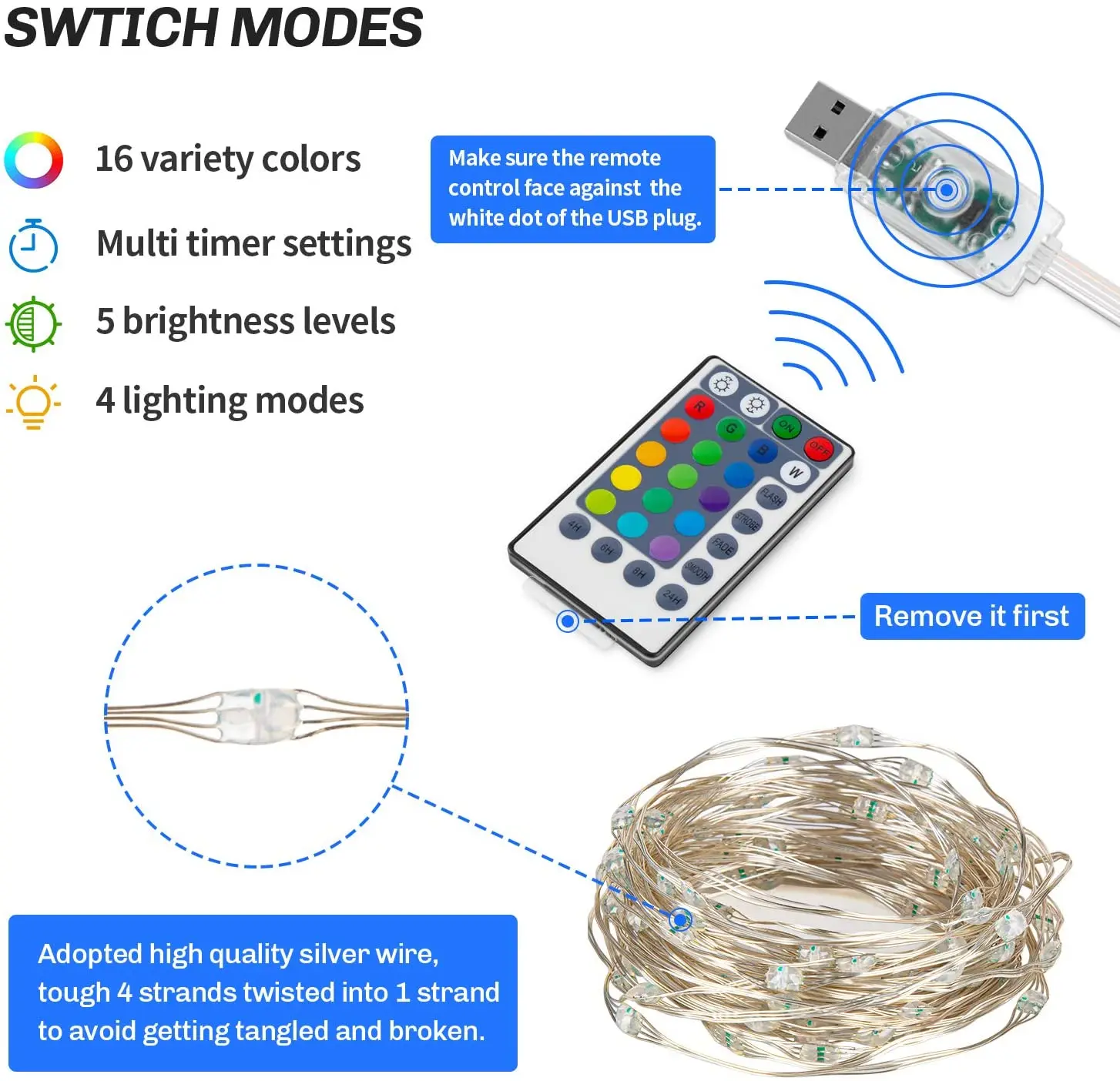 Светодиодная гирлянсветильник с дистанционным управлением, 16 цветов, USB, 5 В, 5 м, 10 м, 20 м