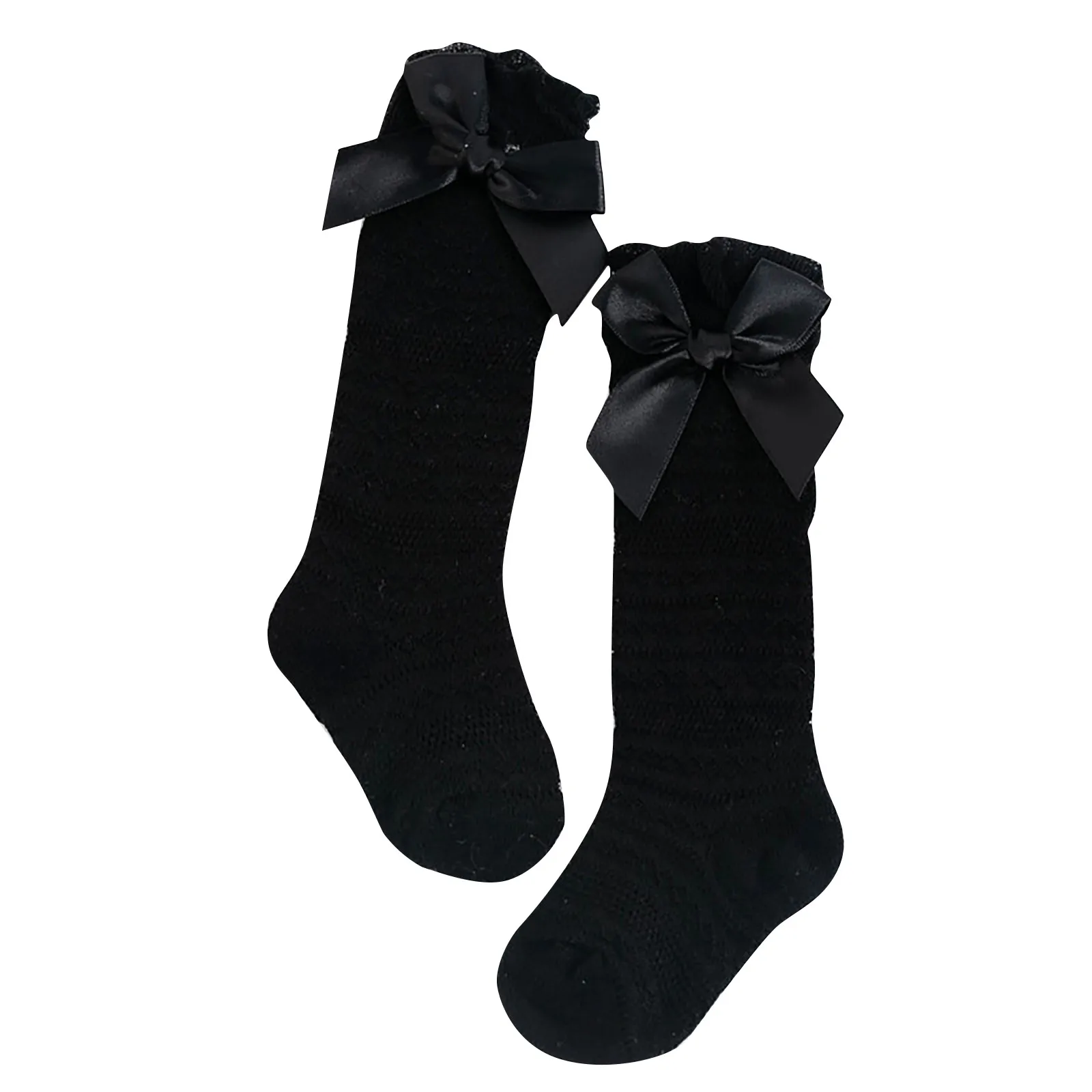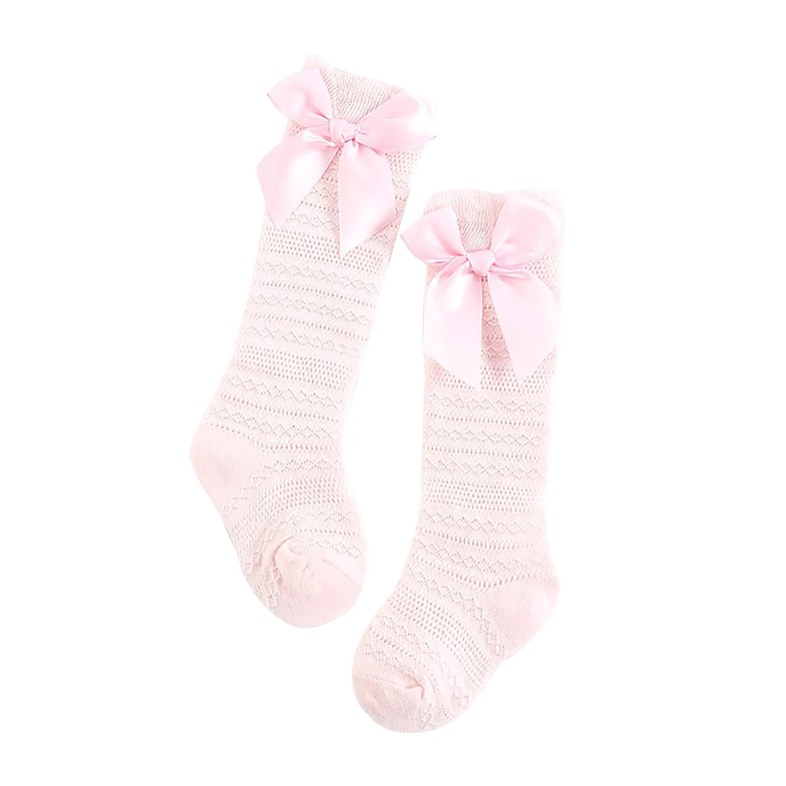 Детские носки из чесаного хлопка, сетчатые носки в горизонтальную полоску с бантиками для маленьких девочек, летние носки для новорожденных, длинные носки принцессы до колена